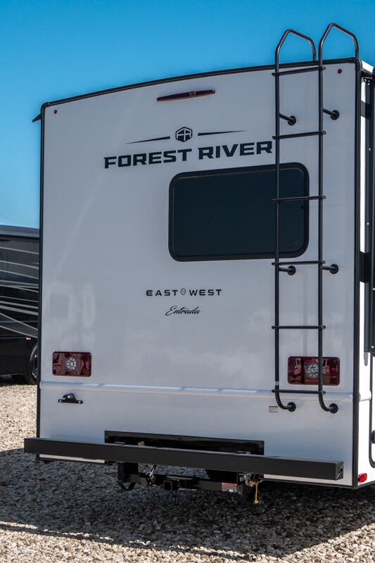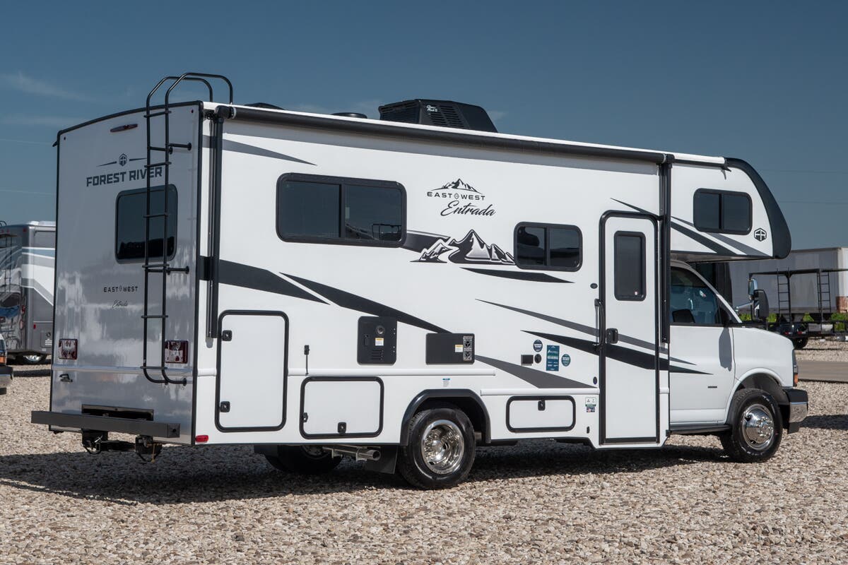 With any Entrada Class C gas motorhome from EAST TO WEST, the construction consists of a one-piece painted fiberglass front cap, a TPO roof membrane, and 2" Azdel composite sidewalls for added durability. There are rotocast exterior storage compartments with slam latch doors, along with an exterior LP Quick Connect, and a power awning with an LED light strip. You will also find rear and sideview cameras to help make maneuvering and parking your RV easier than ever. Inside, you'll feel right at home with soft close hardwood cabinet doors and drawers, a high-altitude tankless water heater, plus a 12V smart TV and USB ports to keep your electronics charged up!