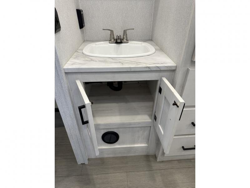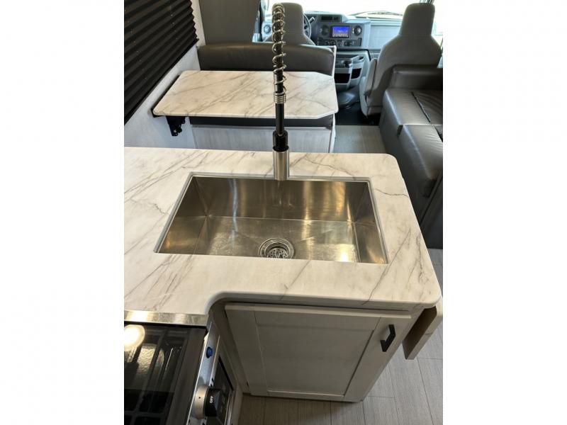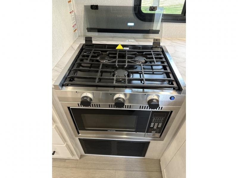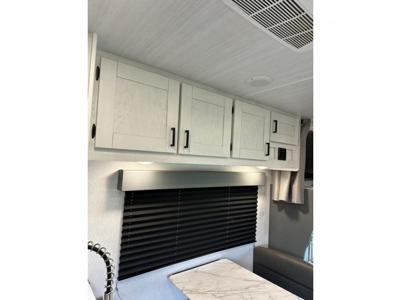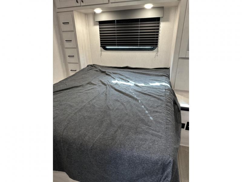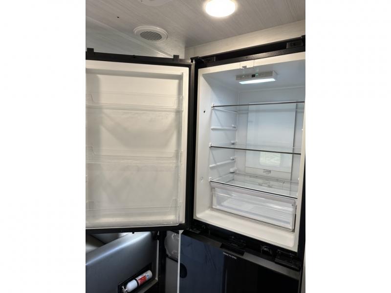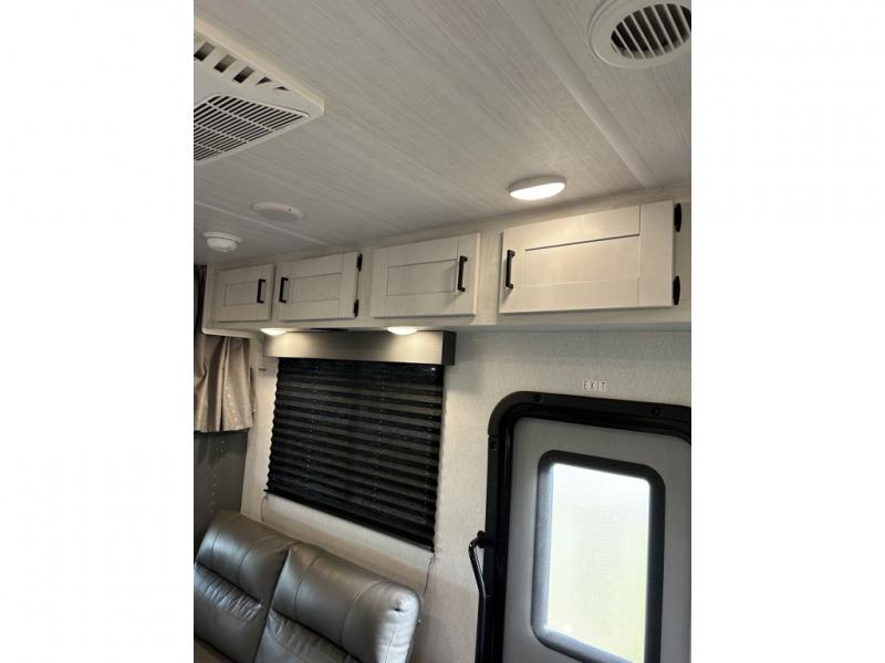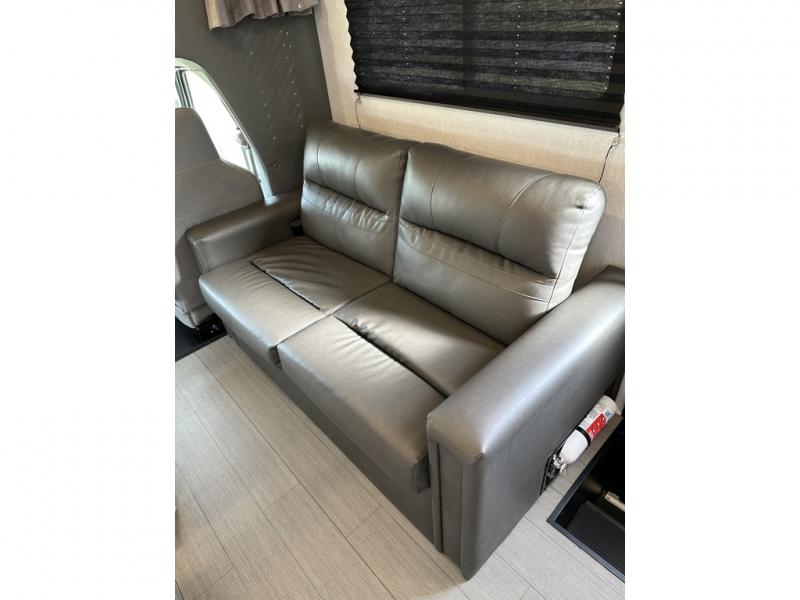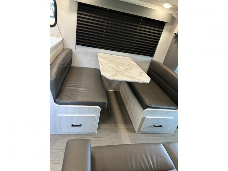 Comfort comes easy in this coach! There is a 62" sofa and 42" x 68" booth dinette that can be used for lounging together after an afternoon of walking around the campground, plus the bunk over the cab and the queen-size bed can be utilized if you are too tired to stay up for another minute. Once you are fully rested, head to the kitchen to prepare a delicious breakfast feast with the cooktop and convection microwave with air fryer technology. Use the double sink to clean up, and the 10.7-cubic foot refrigerator to keep your perishables fresh. You can even add some extra prep space to this area by pulling out the flip-up countertop. There is also storage all throughout this motorhome with bedside closets, the bathroom shelves, a kitchen pantry, cab storage, and within overhead cabinets.
