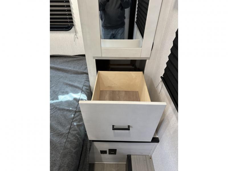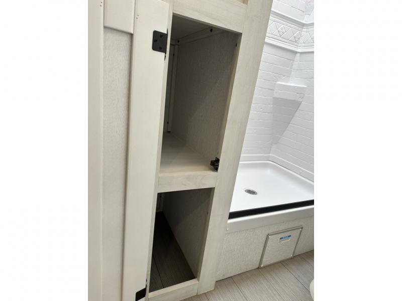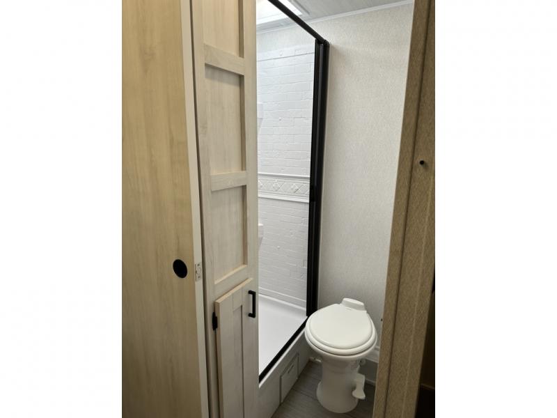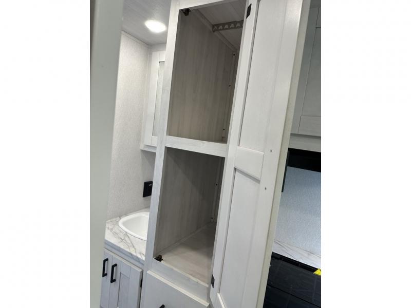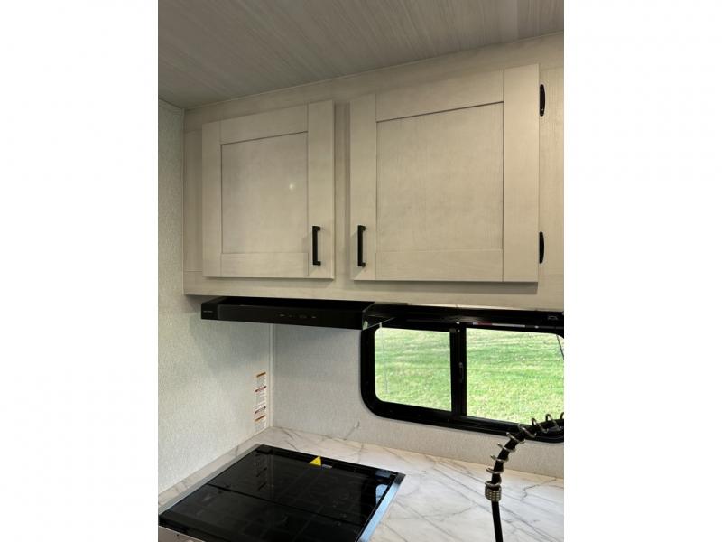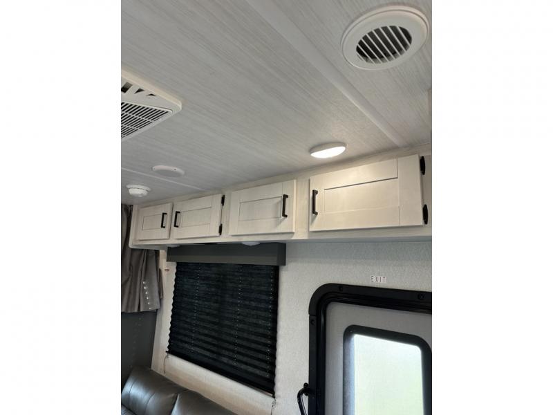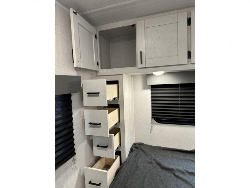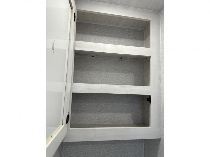 Comfort comes easy in this coach! There is a 62" sofa and 42" x 68" booth dinette that can be used for lounging together after an afternoon of walking around the campground, plus the bunk over the cab and the queen-size bed can be utilized if you are too tired to stay up for another minute. Once you are fully rested, head to the kitchen to prepare a delicious breakfast feast with the cooktop and convection microwave with air fryer technology. Use the double sink to clean up, and the 10.7-cubic foot refrigerator to keep your perishables fresh. You can even add some extra prep space to this area by pulling out the flip-up countertop. There is also storage all throughout this motorhome with bedside closets, the bathroom shelves, a kitchen pantry, cab storage, and within overhead cabinets.