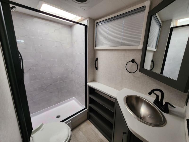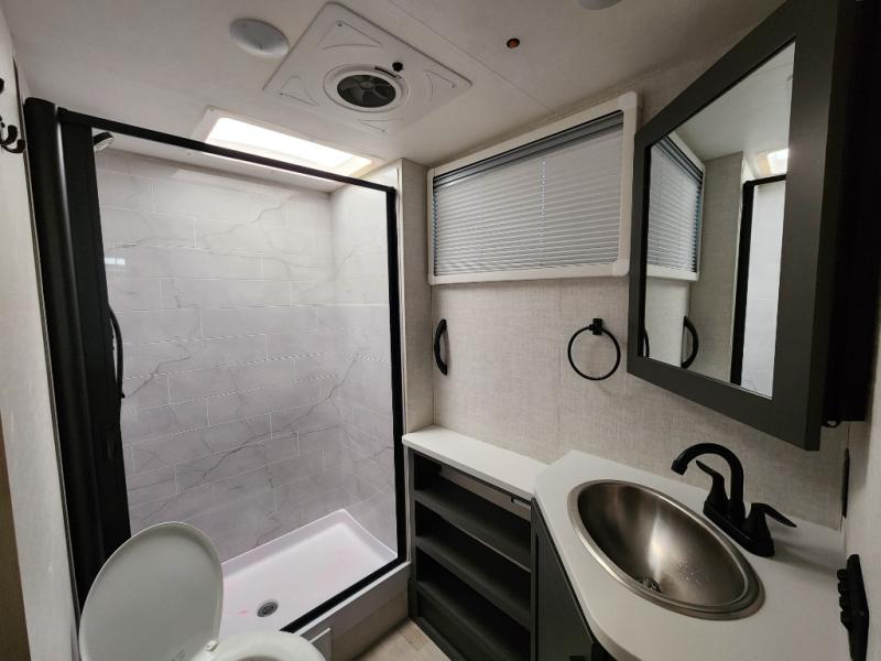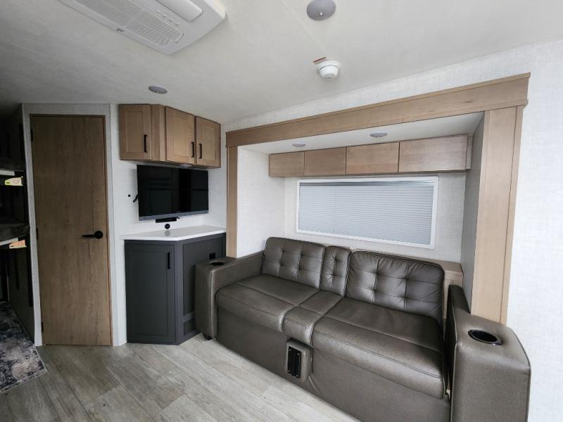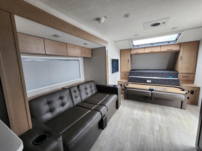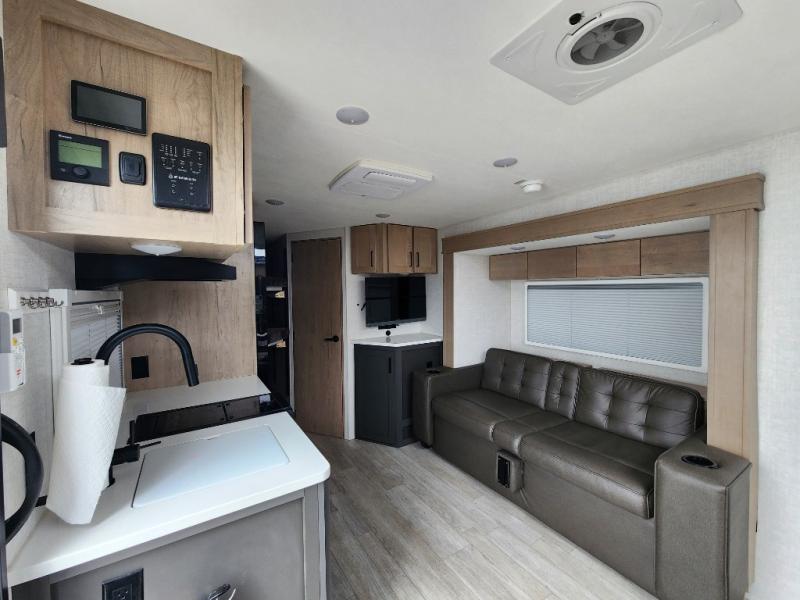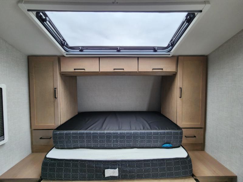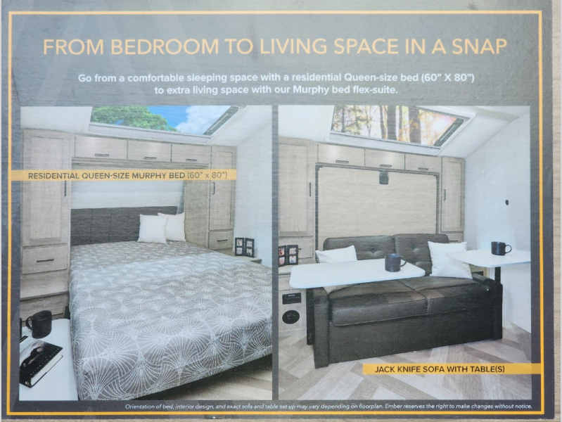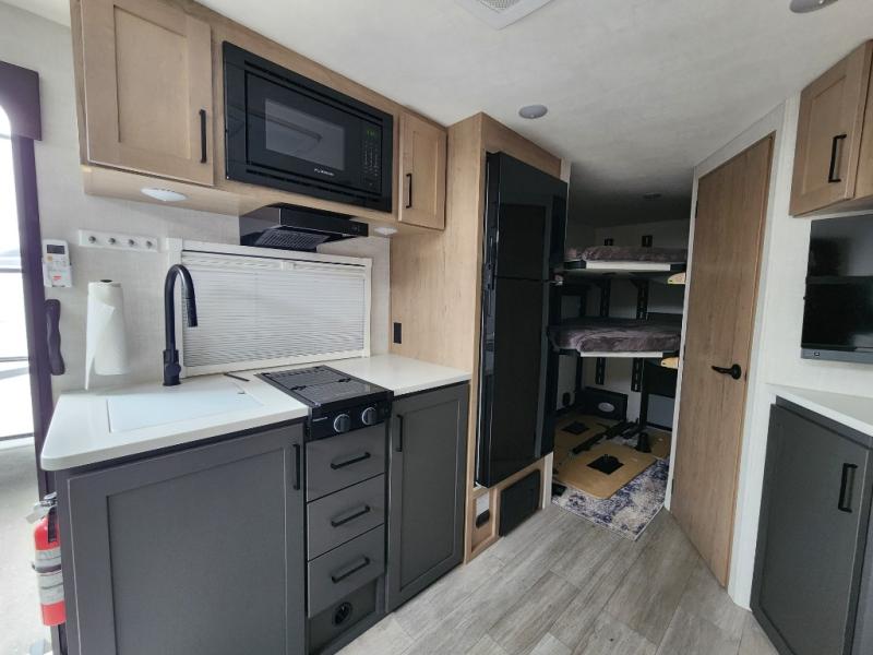 You're going to love everything about this travel trailer that can comfortably sleep three to six people each night, depending on your bunk configurations. There is a spacious storage locker that can be used for hiking gear, plus a kayak/bike storage door for quick and easy packing. The Embertrack system lets you convert the benches to twin bunks, double-size bunks, a desk, or remove them altogether for more storage space. You will enjoy the queen-size Murphy bed up front, along with the "stargazer" skylight for nighttime views, along with dual nightstands and dual wardrobes to keep your clothes tidy. And in the morning you can relax on the jack-knife sofa with a removable table once the bed is put away. This trailer also includes a full kitchen with a 12V refrigerator, an air fryer convection microwave oven, a dual burner cooktop, and a stainless steel sink for easy clean-up.