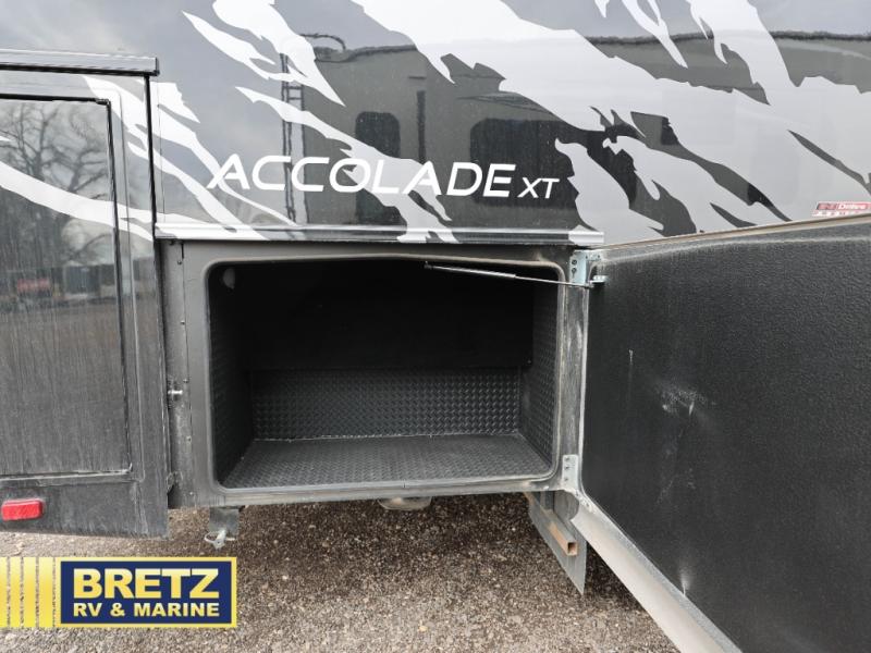 You'll have grand adventures in the Accolade XT Super C diesel motorhome. The Ford 4X4 chassis can tackle difficult roads, but with the E-Z Drive Premier, you'll enjoy a combination of features that make your ride more comfortable, including a computer-balanced driveshaft, front and rear heavy-duty stabilizer bars, and Koni® shocks. The convenience continues into the cockpit, where you'll find an 8-way power driver seat and the Ford SYNC 4 infotainment center to cover all your entertainment needs. The Firefly Multiplex command center lets you operate multiple systems, even from a mobile device. Inside, you'll enjoy integrated day/night cassette shades, LED-lit solid surface kitchen countertops, large bedroom wardrobes, and a decorative shower surround with a glass door to name a few comforts!