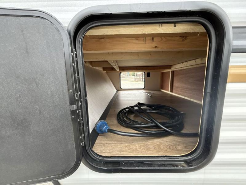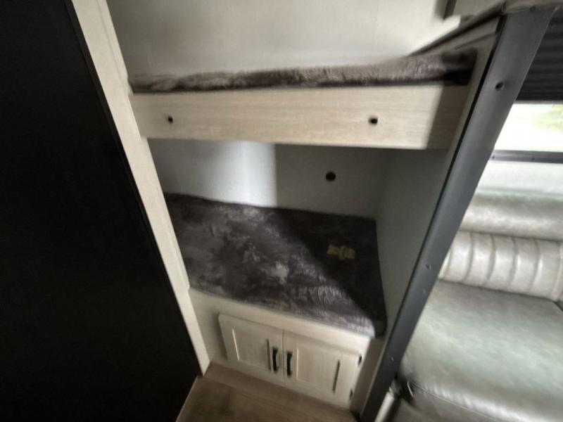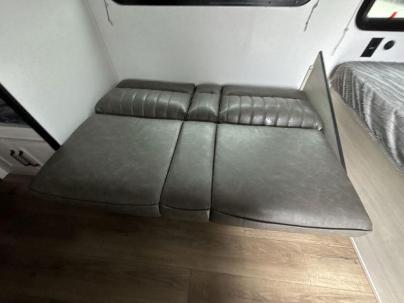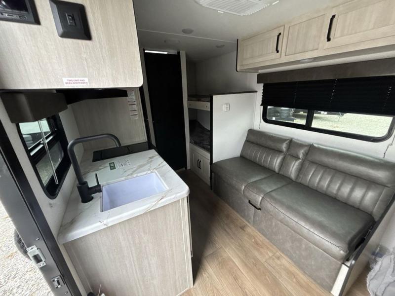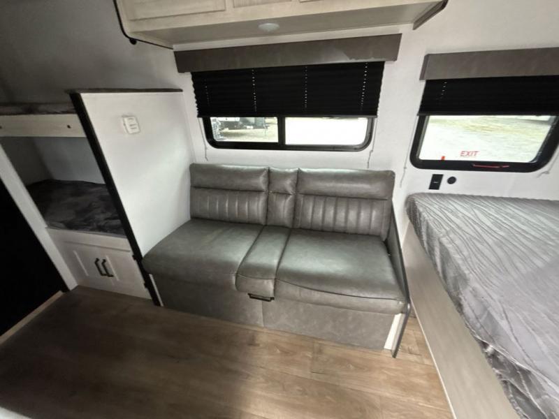 It will be so easy to enjoy camping trips in this single axle travel trailer! There is a front RV queen bed with flip-up storage at the foot of the bed for your belongings, and any additional guests can sleep on the bunk beds and sofa. A full kitchen includes a two-burner cooktop and microwave to cook meals each day, and the 12V black glass refrigerator will keep your food fresh. And a private bath with a toilet and shower will let you freshen up without having to use the camp's facilities!