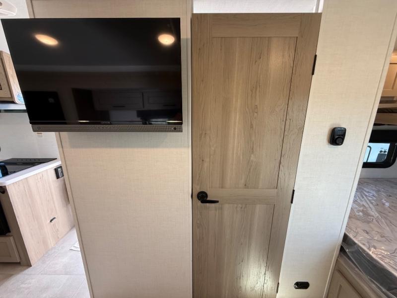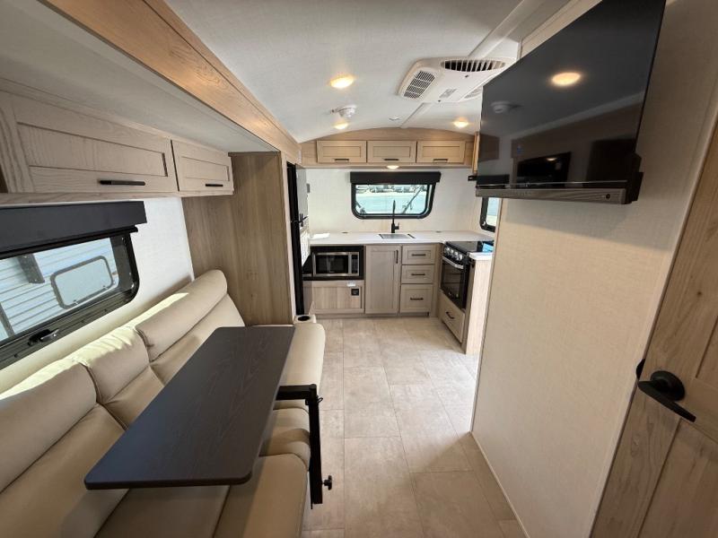 Are you looking for a lightweight trailer with at-home comforts? Take a look at this single slide out unit that can sleep three to four each night. There is a queen-size bed in the back with a 26" x 80" flip-up bunk for cozy sleeping space, a 72" sofa with cupholders to relax on, plus a 12V TV for movie nights! The front kitchen includes a 12V refrigerator to store food, plus a microwave oven and a gas oven to cook meals each day.
