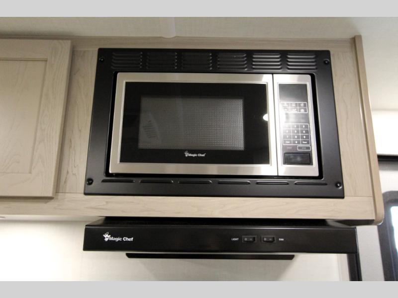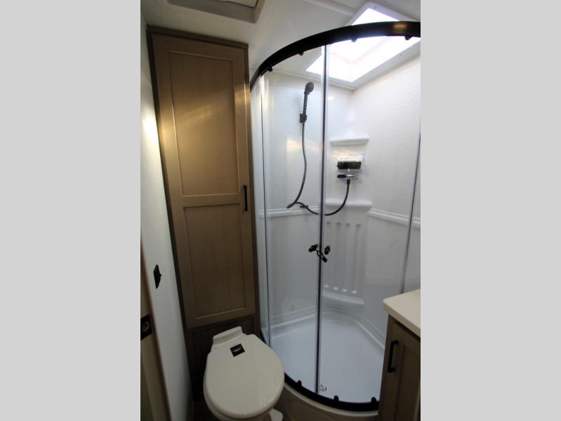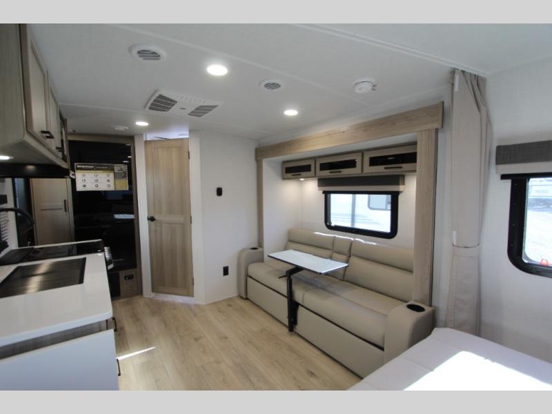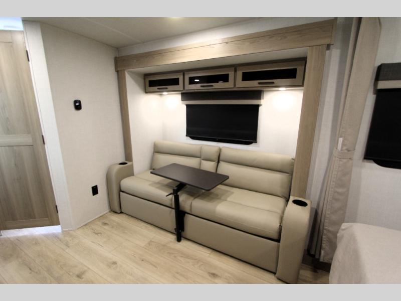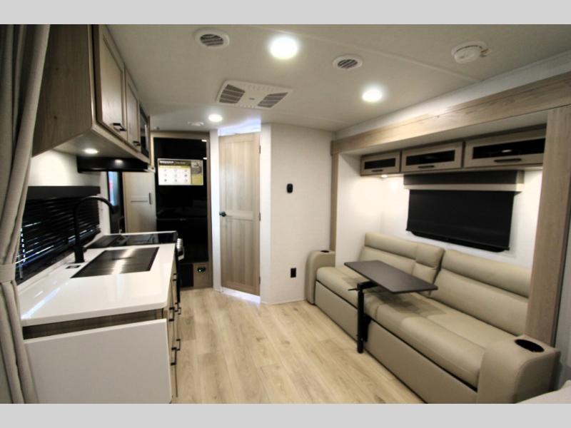 Wherever you decide to camp, you will love every minute in this cute couple's trailer. The sofa slide with a table will provide a place to relax, eat, and even sleep an extra guest if you have one, and the front RV queen bed includes a privacy curtain to enjoy your own space. There are dual bedroom wardrobes to keep your clothes tidy, and you'll find two pass-through storage compartments for your larger gear. Since there is a full bath on board you won't have to use the camp's facilities, and you can make it a movie night with the TV in the main living area!