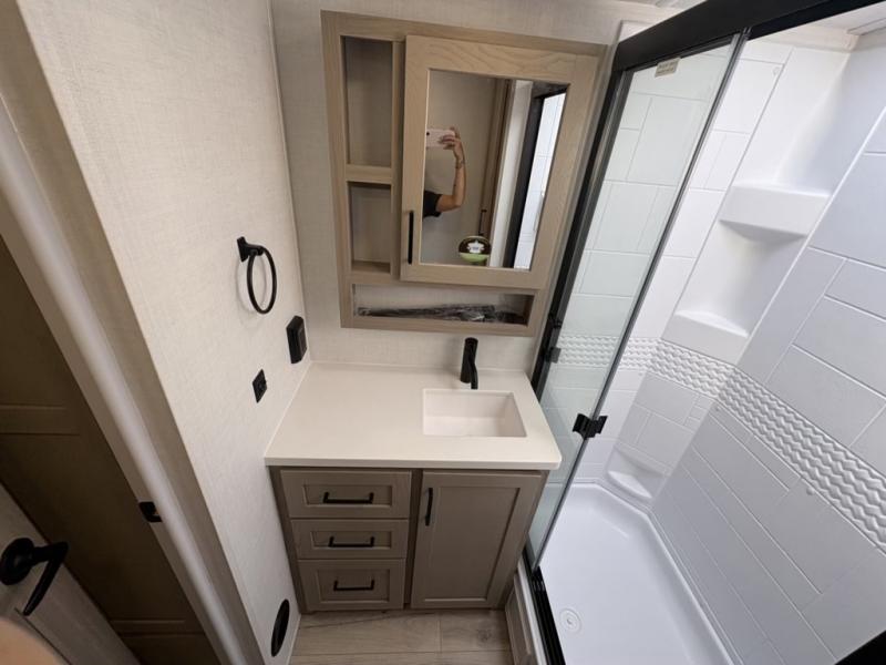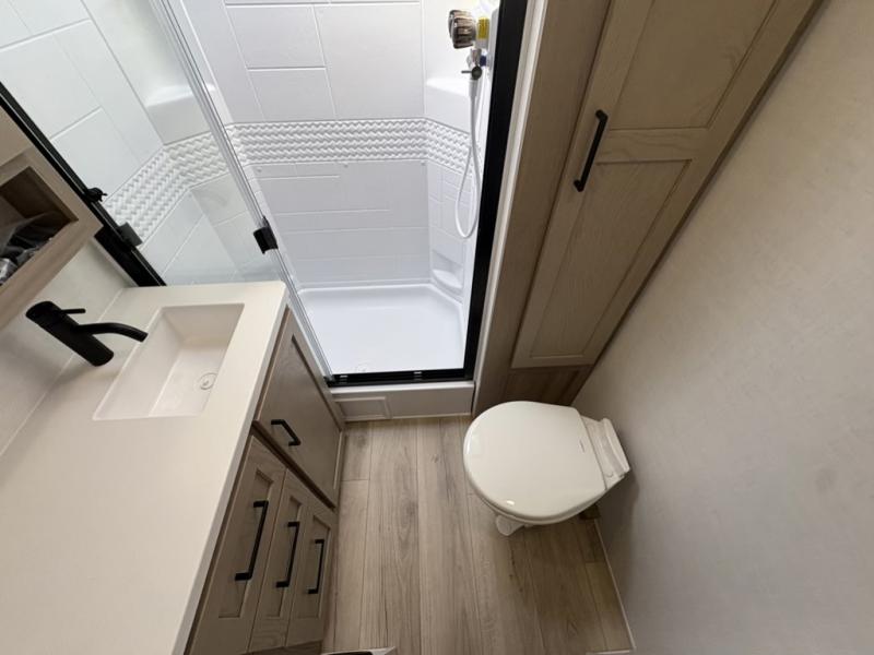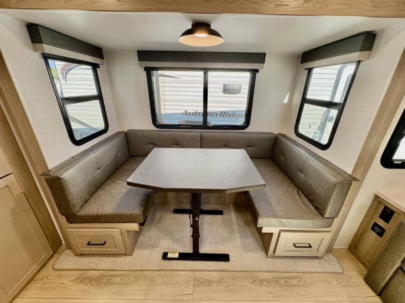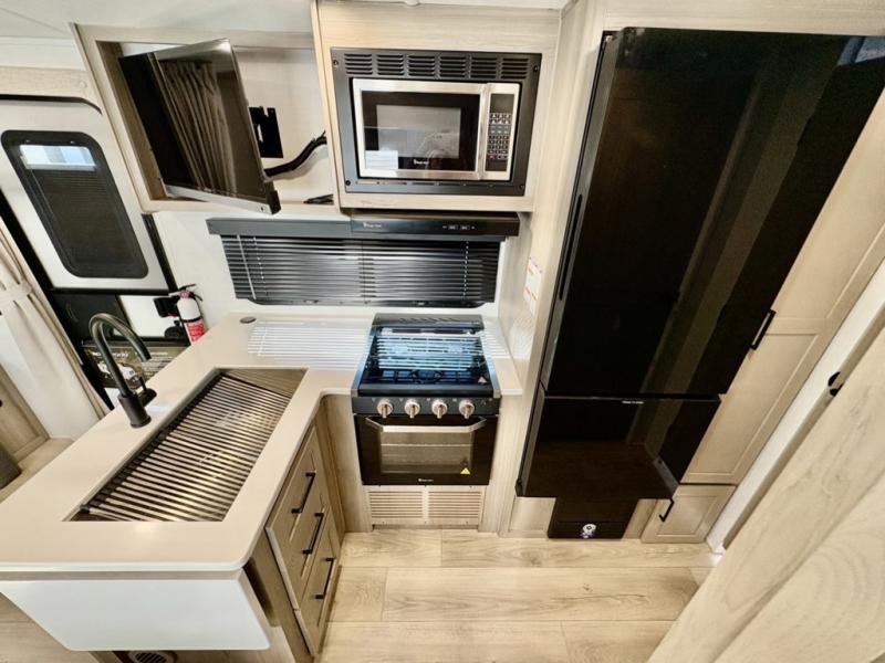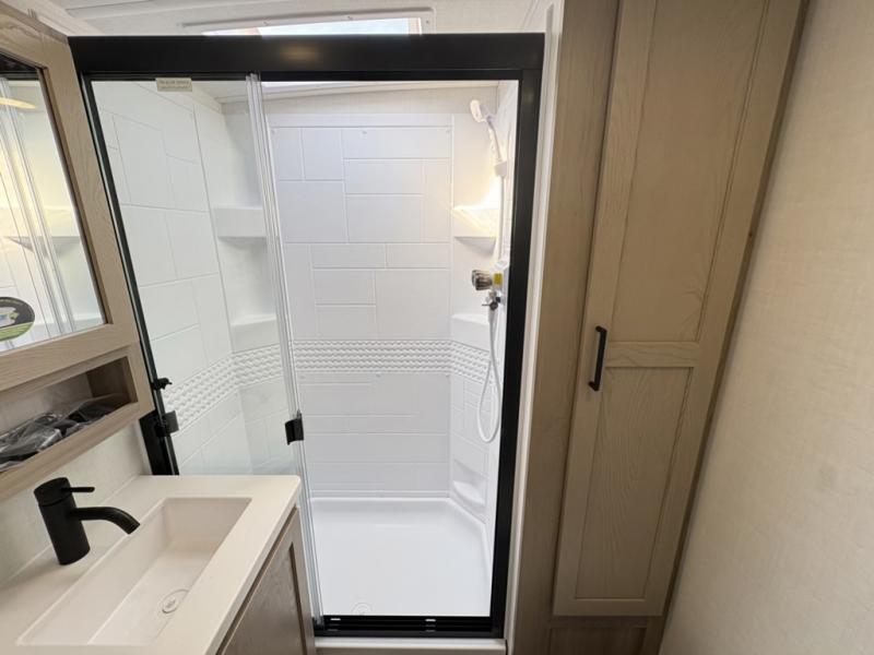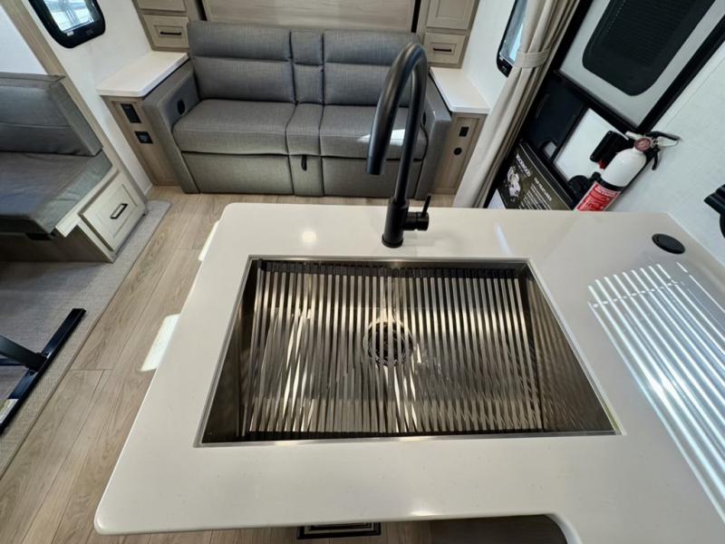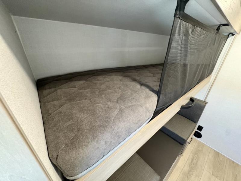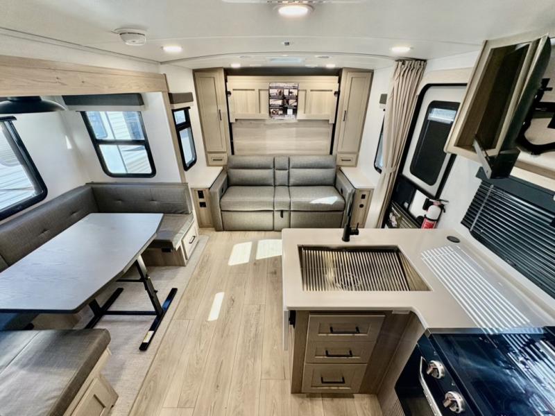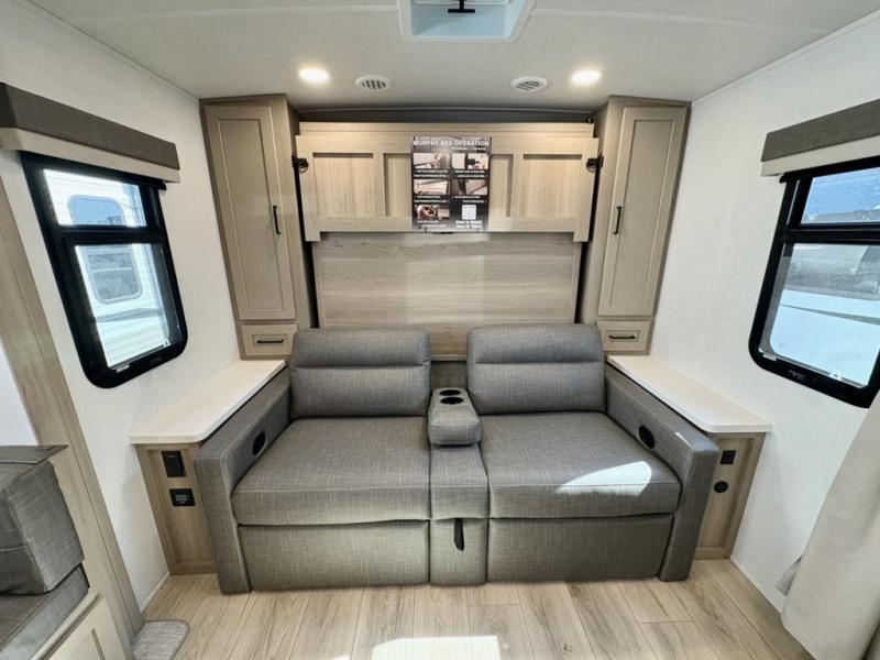 This trailer is one the whole crew will love! Start unloading the pass-thru storage when you arrive at your campsite, then put out the 18' power awning and start lunch on the exterior griddle. There is a full bath inside when you need to freshen up, and the fully-equipped interior kitchen can be used if the weather isn't cooperating with your plans. A U-shaped dinette slide provides a place to dine together and play board games, and two guests can sleep here at night. Speaking of nighttime, there is also a private bunkhouse in the back with a Dream Dinette and flip-up bunk plus a slide out for more space and an optional TV. You'll find your own space up front on the RV queen Murphy bed, complete with dual wardrobes and a privacy curtain when you need to get dressed. And in the morning you can fold away the bed to relax on the 74" sofa!