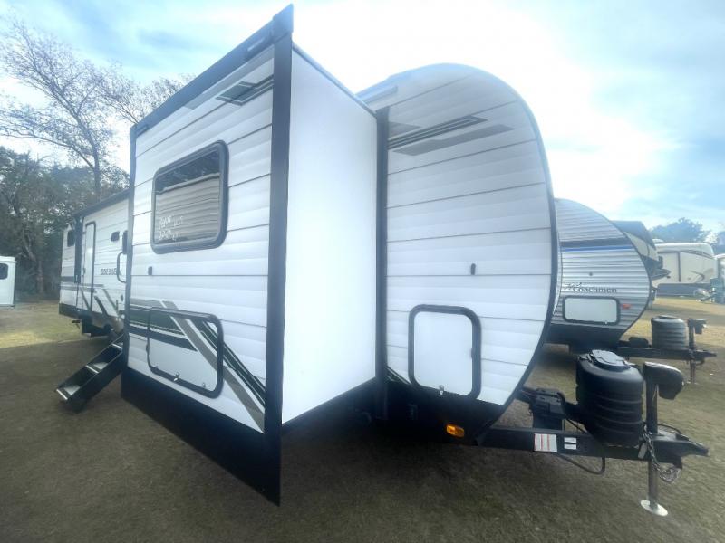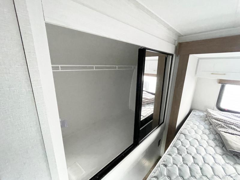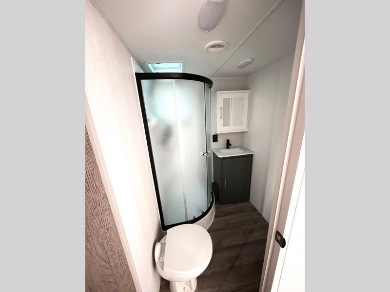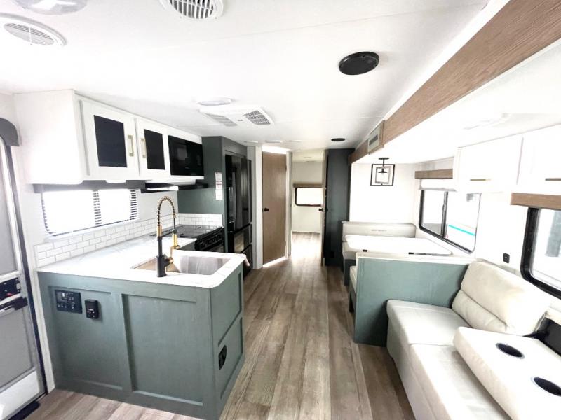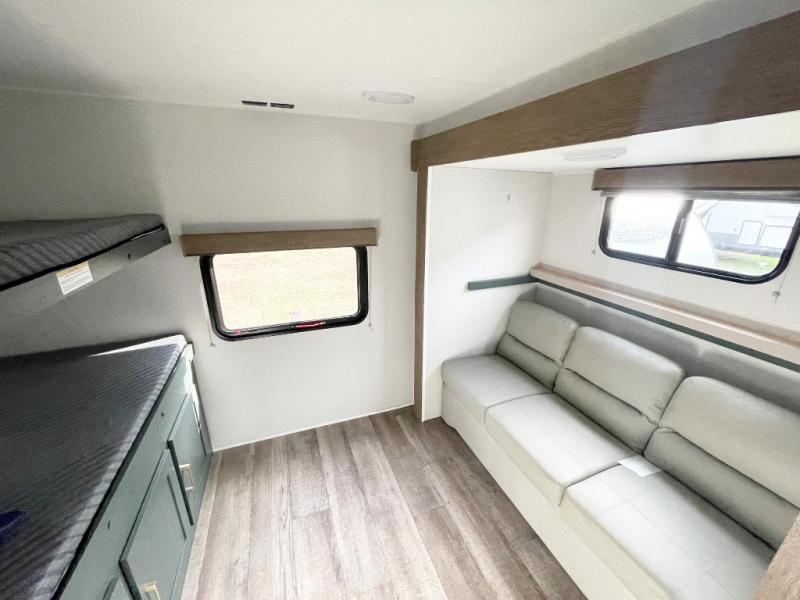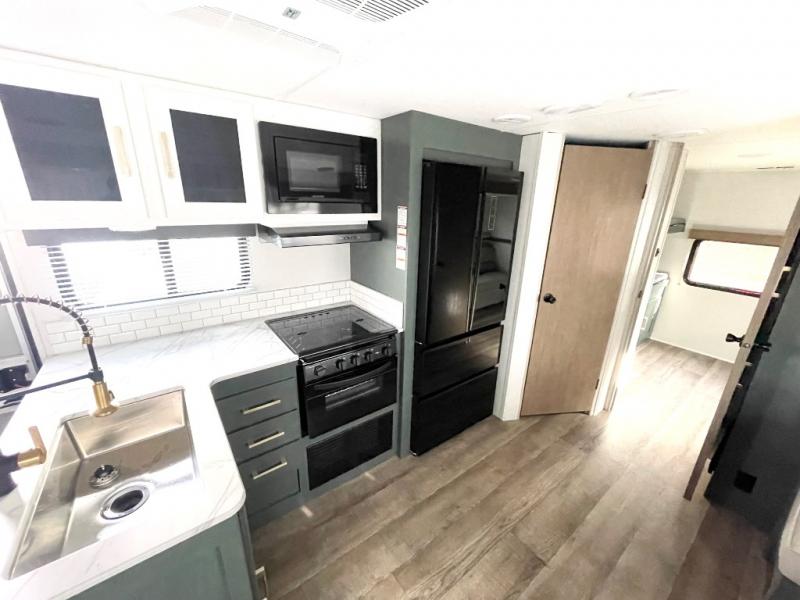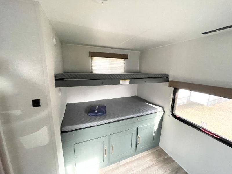 There is convenience found all throughout this travel trailer! Starting with the dual entry doors with one of them leading directly into the half bathroom. The kiddos will have their own privacy with the rear private bunkhouse which has a set of bunk beds and a slide with a bunk bed over a sofa. You will enjoy your own privacy with the front private bedroom that has a queen bed slide across from a dresser, a sliding barn door, a front large wardrobe and even a closet that is prepped to add a washer and dryer to it. Meals can be made easy with the fully equipped kitchen which even has an air fryer oven, plus you can cook meals while breathing in fresh air with the outdoor kitchen. Everyone can gather together at the booth dinette for meals, games, and even transform it into an extra sleeping space. The sofa is a great place to wind down at night by the entertainment center with a 39" TV and fireplace!
