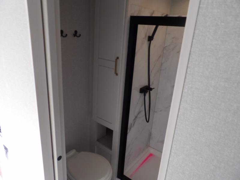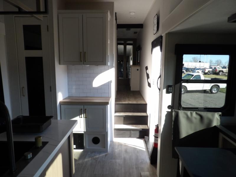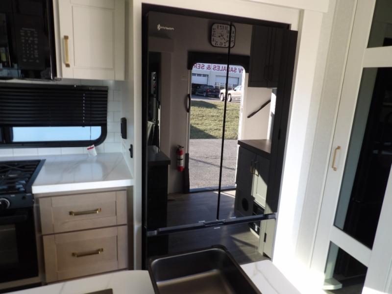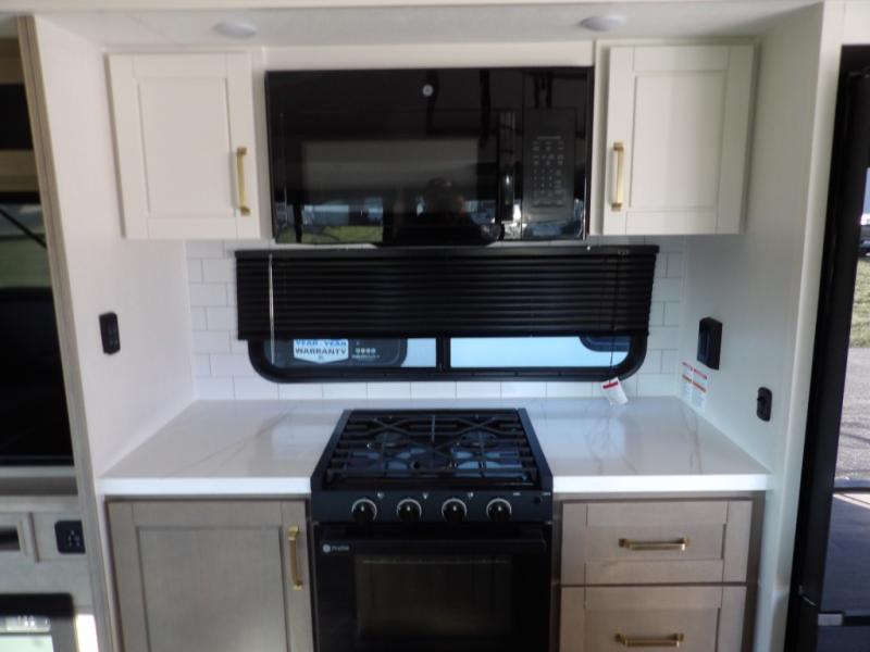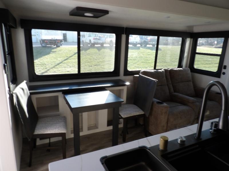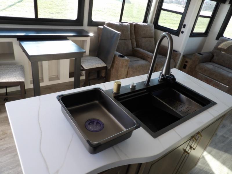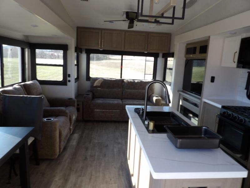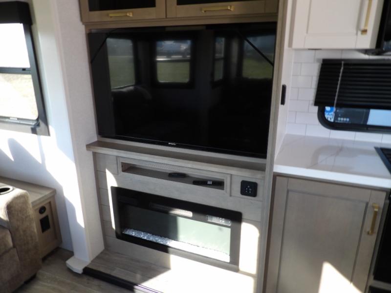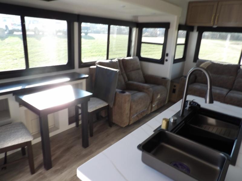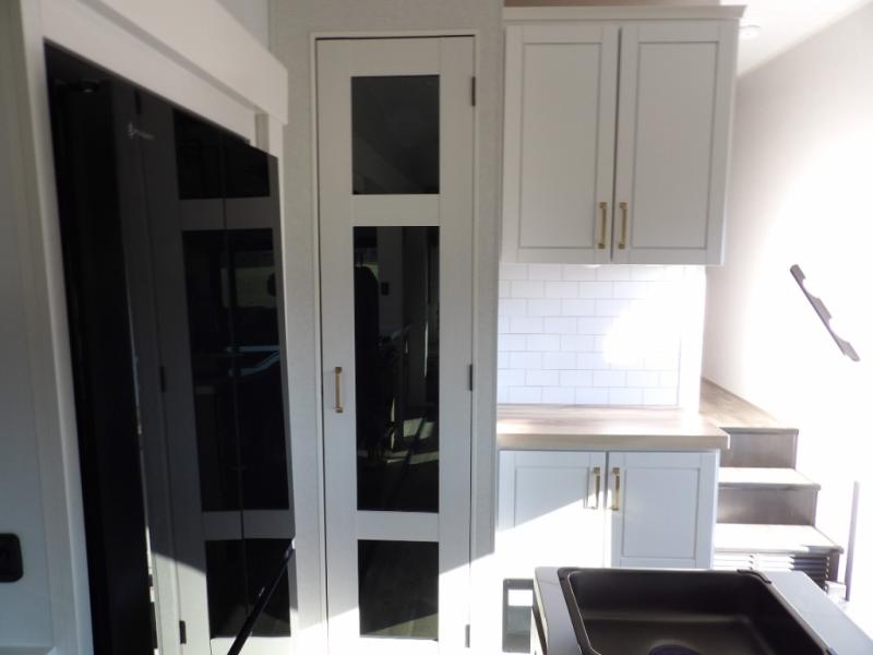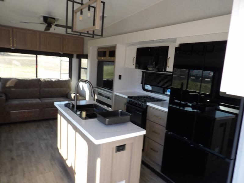 Triple slides for space, plenty of seating spaces, plus a spacious private bedroom make this fifth wheel one you won't want to pass up! You can freshen up each day in the full bath that includes a residential style glass shower door, a bathroom skylight, and a medicine cabinet to keep this space organized. Once you've cut up some fresh fruit at the kitchen island, whip up some eggs and bacon for breakfast, or just grab the cereal from the pantry. There is a spacious 16 cu. ft. 12V refrigerator, plus a hutch where you can store your own coffee machine. Relax on the tri-fold sofa, theater seat, or free-standing table with chairs/bench before heading out for the day. The king bed slide out in the front private bedroom will be waiting for you when you return!