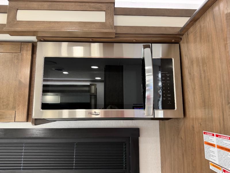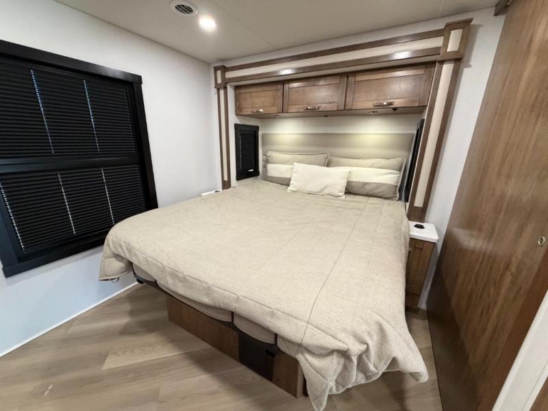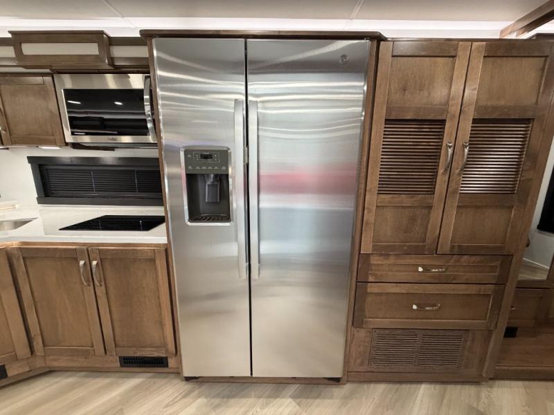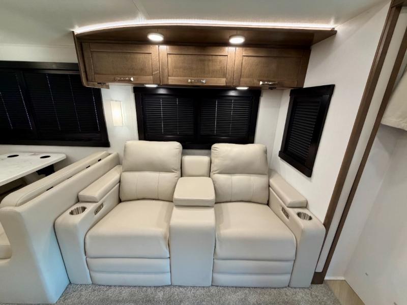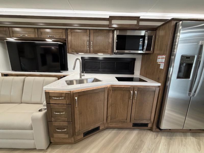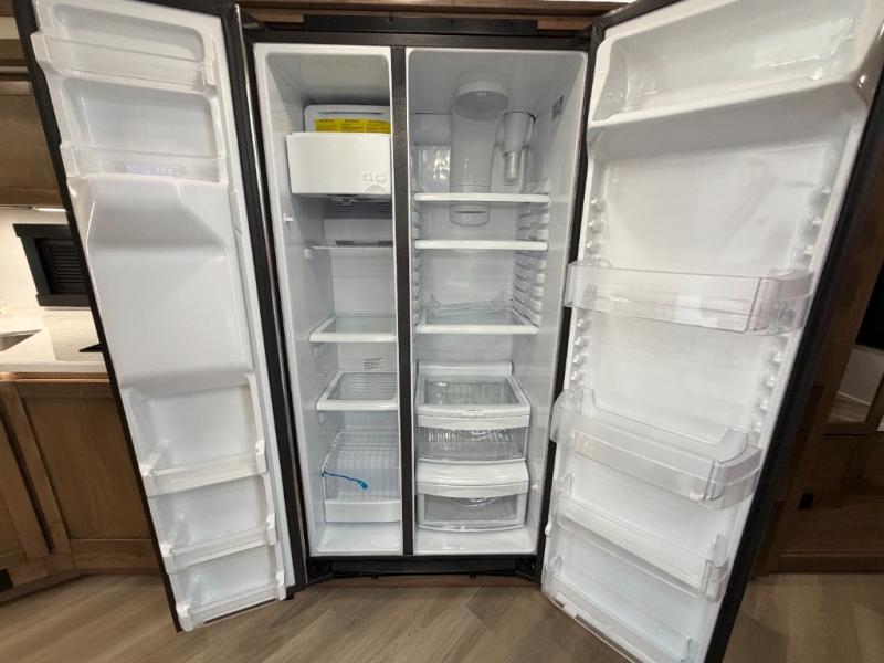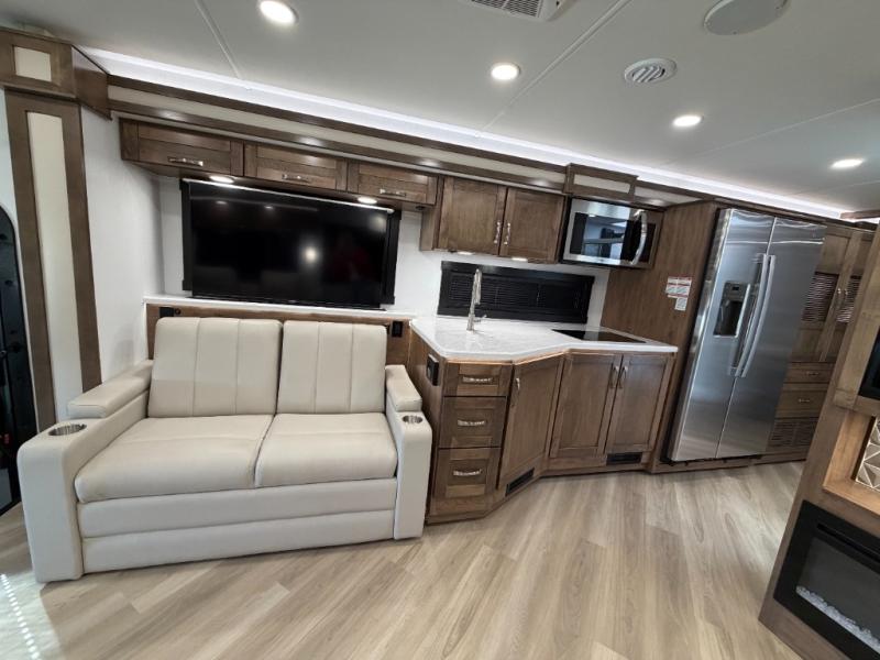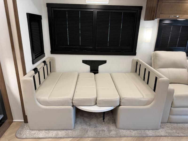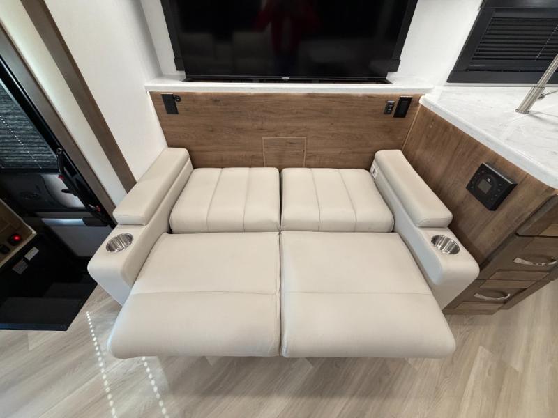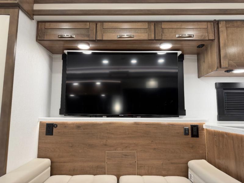 There is room for your small family to go on a country excursion together in this motorhome! The chef can prepare their best meals with the two-burner induction cooktop, enjoy them at the booth dinette, and store any leftovers in the residential refrigerator, plus there is a hutch to store your dishes. The 50" LED Smart TV is on a lift above the jackknife sofa and across from the power theater seating. You could even watch the big game outside with the exterior entertainment center that comes with outside speakers and an LED HD Smart TV mounted on a swivel bracket, plus you will be protected by the 23' electric awning!