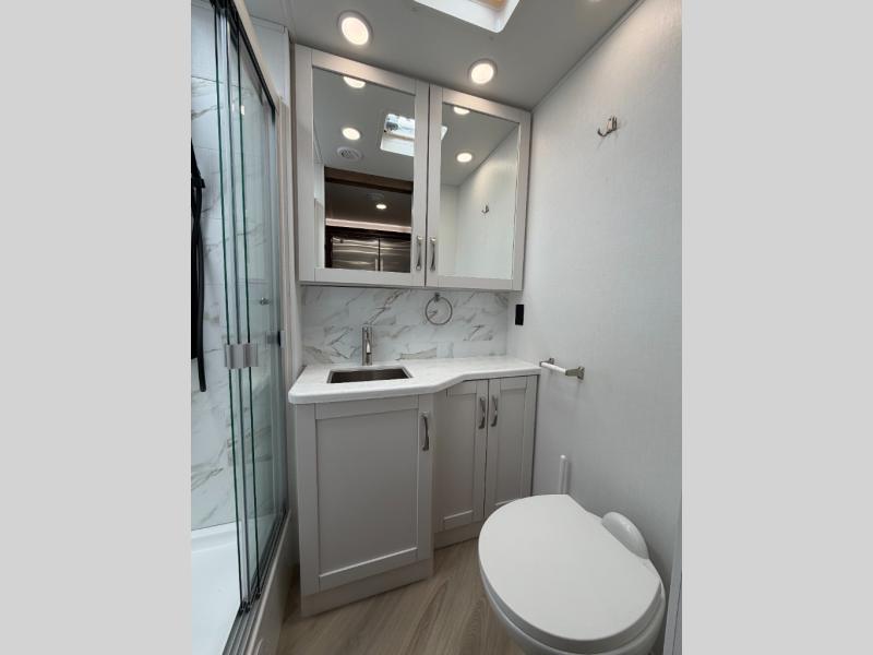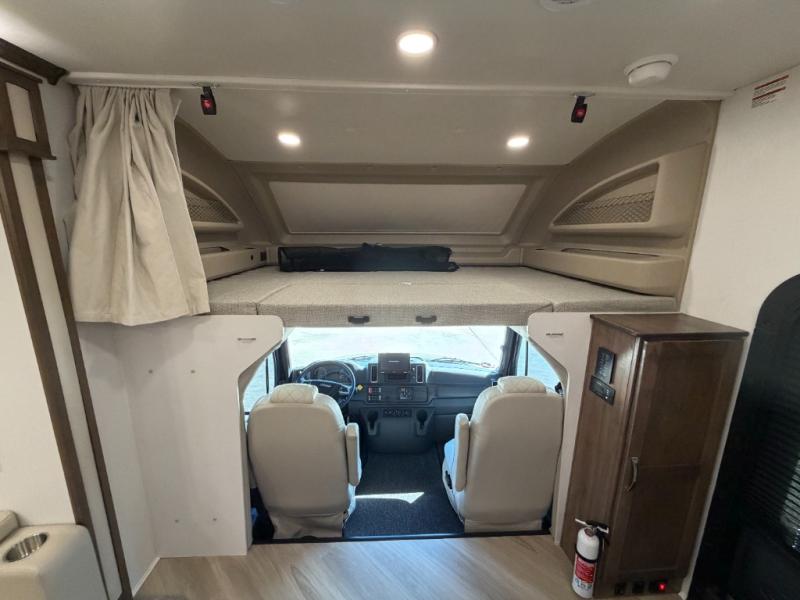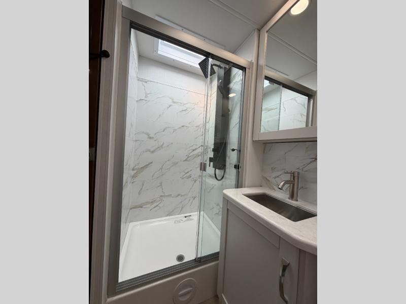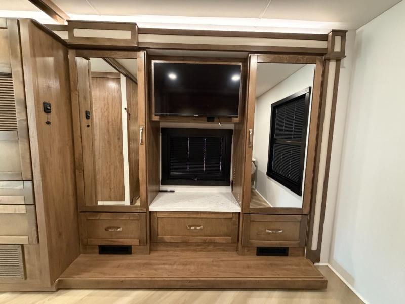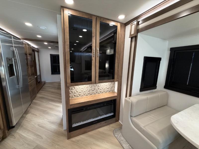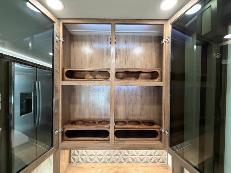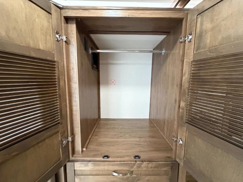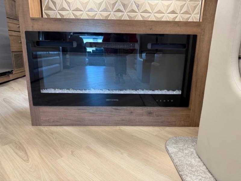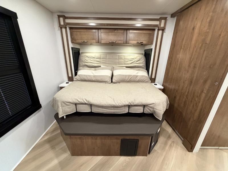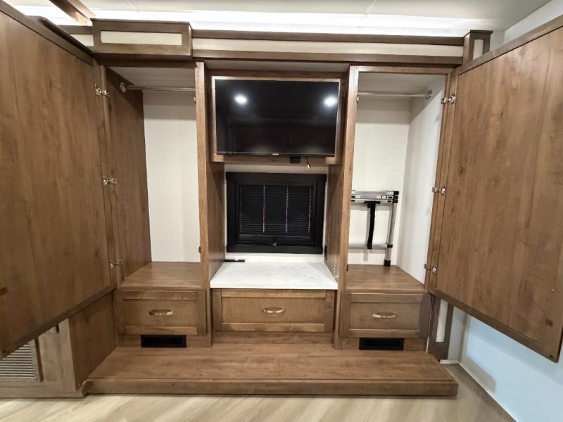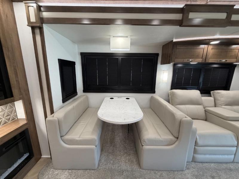 There is room for your small family to go on a country excursion together in this motorhome! The chef can prepare their best meals with the two-burner induction cooktop, enjoy them at the booth dinette, and store any leftovers in the residential refrigerator, plus there is a hutch to store your dishes. The 50" LED Smart TV is on a lift above the jackknife sofa and across from the power theater seating. You could even watch the big game outside with the exterior entertainment center that comes with outside speakers and an LED HD Smart TV mounted on a swivel bracket, plus you will be protected by the 23' electric awning!