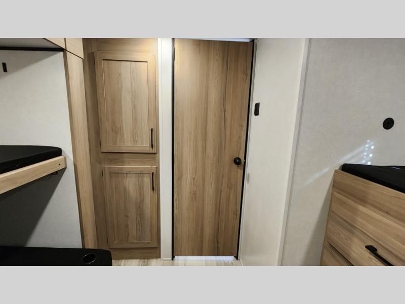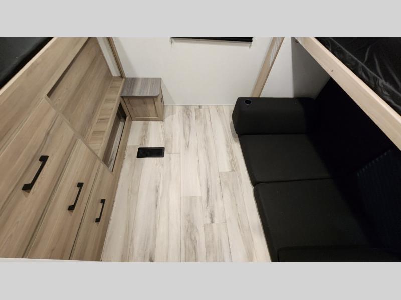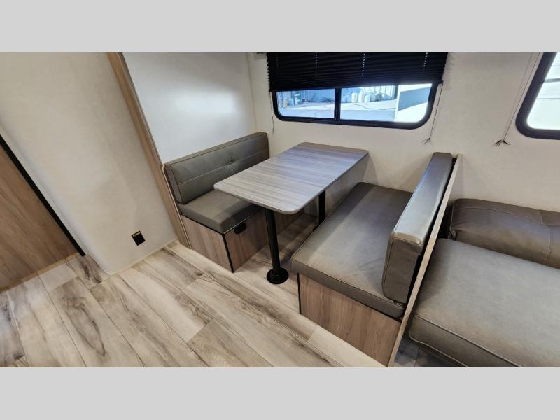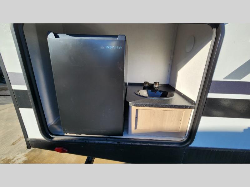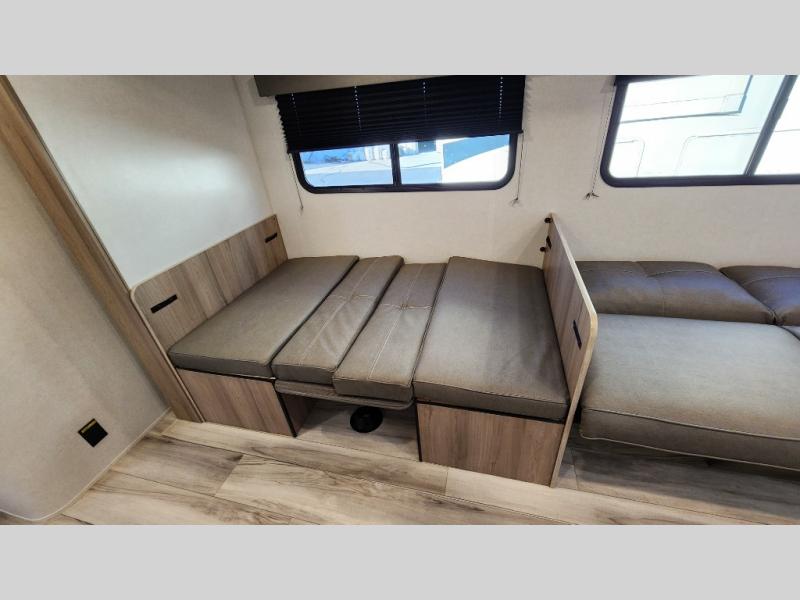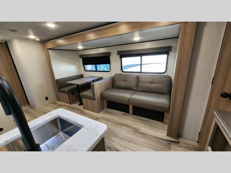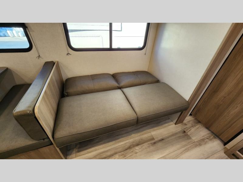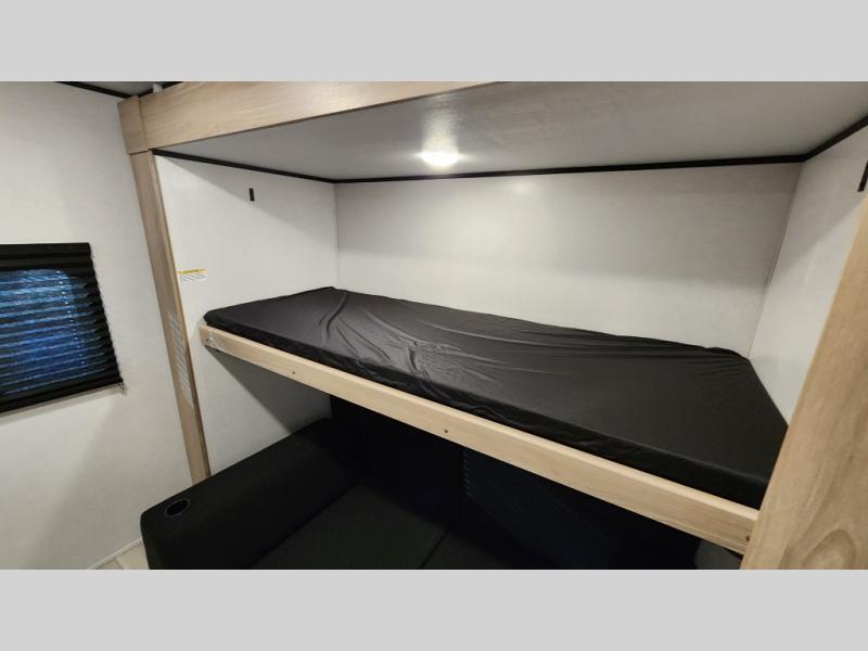 The whole gang will love camping in this rear bunkhouse travel trailer! Here, you'll find a slide out with a flip-up bunk and couch below, across from a second bunk plus a wardrobe for clothes. The full bath is right next to the bunkhouse for easy nighttime use, and you'll find one of the dual entry doors here for added convenience. Up front, a private bedroom will make this unit feel more like home, and there are two entry doors to the bedroom, providing easy access to each side of the bed. Your crew can meet in the combined kitchen and living area to play a game at the booth dinette or relax on the sofa within the large slide out. If the weather is nice, you may just find yourselves outside under the 21' power awning, while enjoying the outdoor sink and refrigerator!