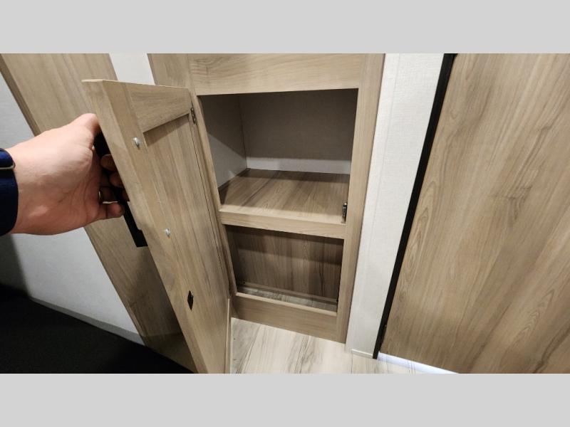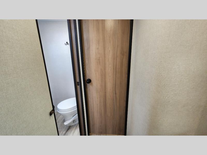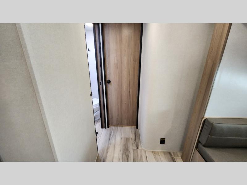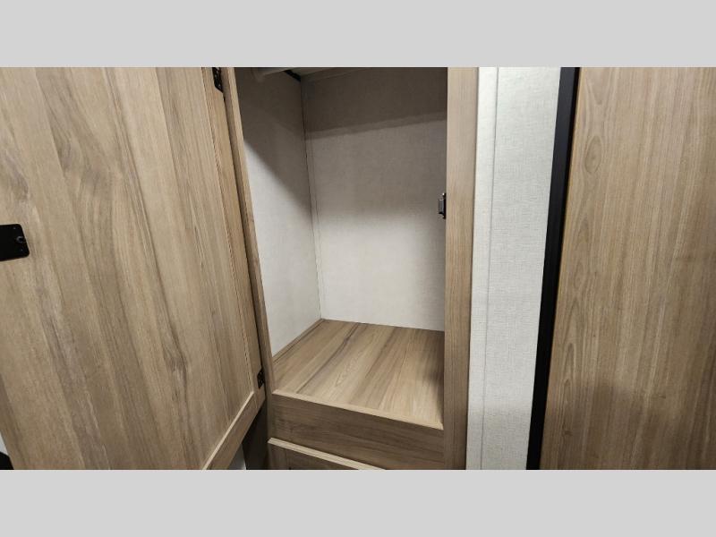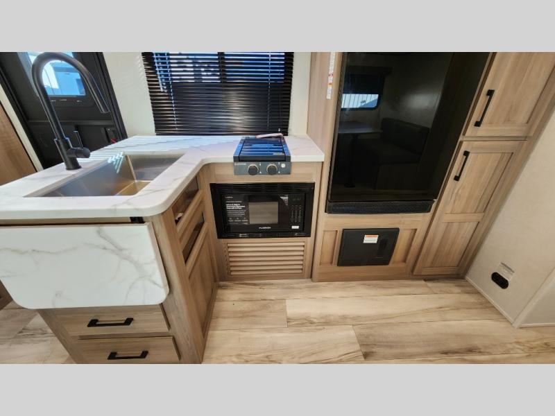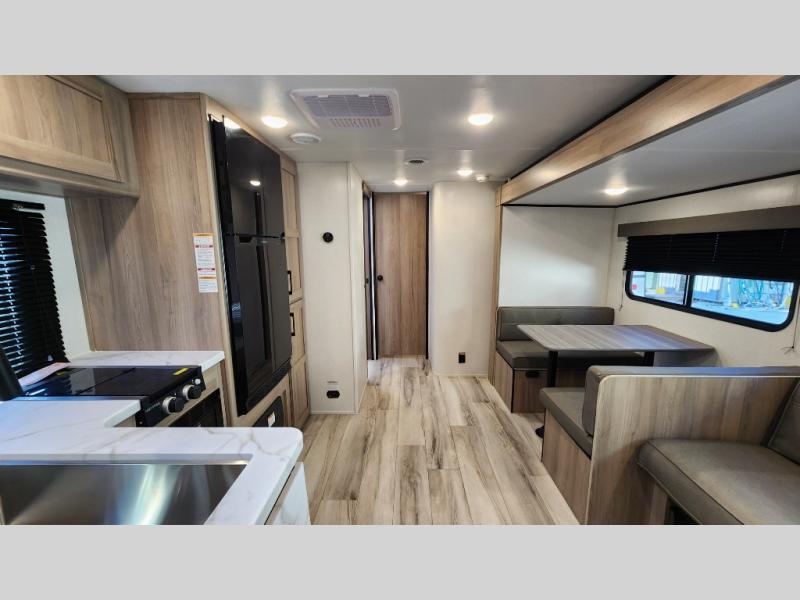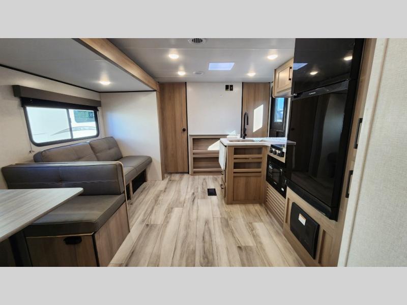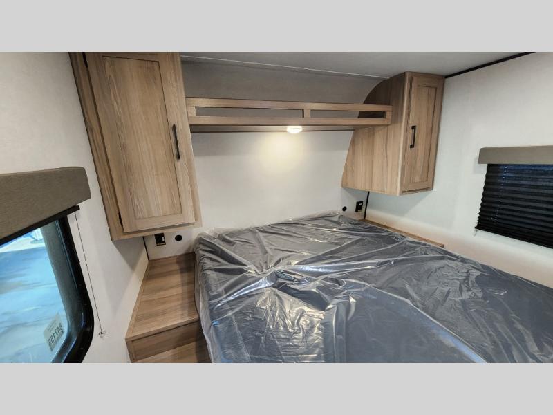 The whole gang will love camping in this rear bunkhouse travel trailer! Here, you'll find a slide out with a flip-up bunk and couch below, across from a second bunk plus a wardrobe for clothes. The full bath is right next to the bunkhouse for easy nighttime use, and you'll find one of the dual entry doors here for added convenience. Up front, a private bedroom will make this unit feel more like home, and there are two entry doors to the bedroom, providing easy access to each side of the bed. Your crew can meet in the combined kitchen and living area to play a game at the booth dinette or relax on the sofa within the large slide out. If the weather is nice, you may just find yourselves outside under the 21' power awning, while enjoying the outdoor sink and refrigerator!