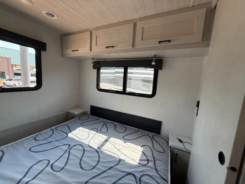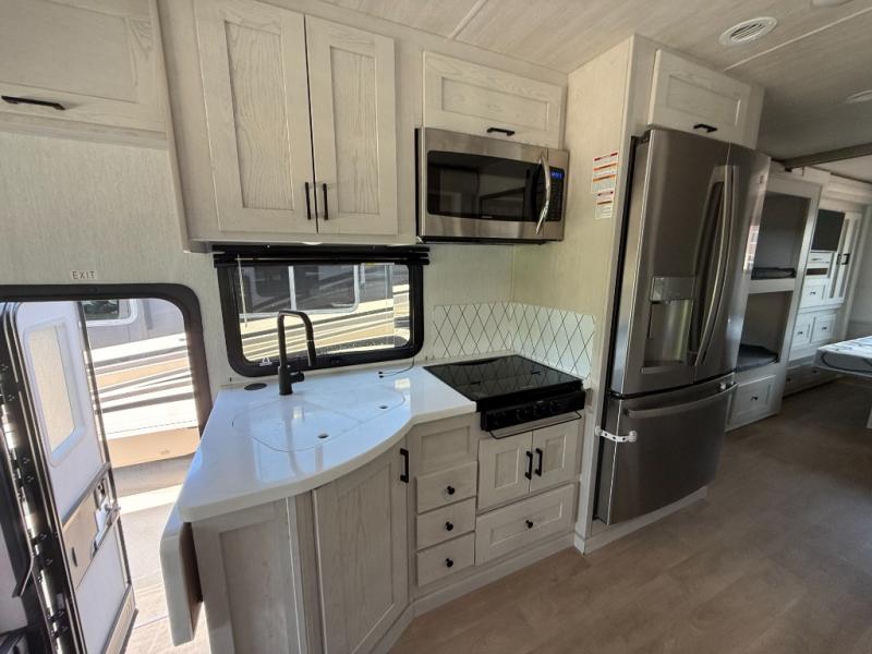This family-friendly coach allows your family of eight enough sleeping space, and with two slide outs everyone will have plenty of floor space to move around easily. Everyone can gather in the main living and kitchen area and find seating on the deluxe booth dinette, the deluxe tri-fold sofa, the two captain's chairs and the Euro recliner. After you have made plans for the day, you can eat your meal made in the kitchen with full amenities including a residential refrigerator and convection microwave. And the solid surface countertops add to the interior style. You will also find a king bed in the rear bedroom, bunk beds or choose the optional wardrobe in its place. There is also a full bathroom and a cab over bunk the kids will surely love.