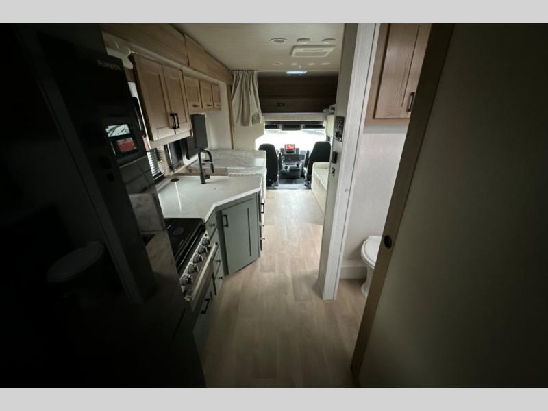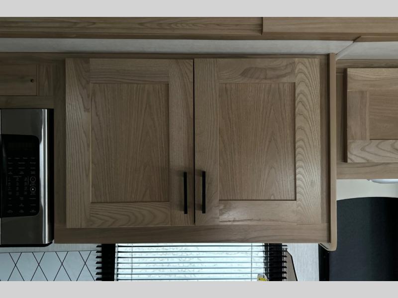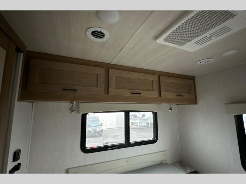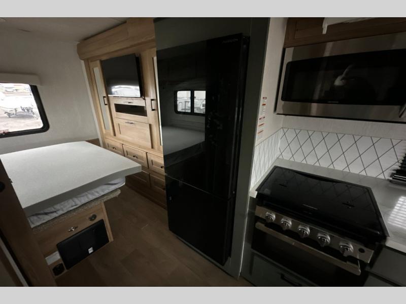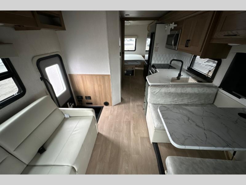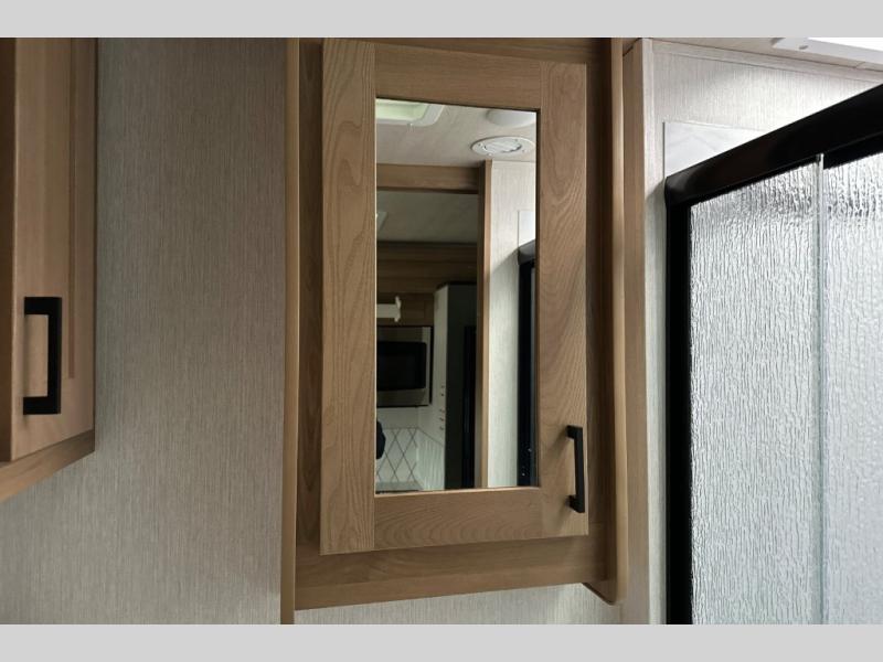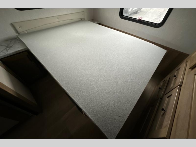 The full-wall slide on this coach is what will make it feel more open, just like at home! You can prepare meals on the three burner cooktop, or in the stainless steel microwave. There is a booth dinette to dine at and a 10 cu. ft. 12V refrigerator to store your leftovers. A sofa will also provide seating and sleeping space, along with the bunk over cab! This model includes a full bath with a shower skylight, electric roof vent, and a large medicine cabinet to store your things. When you're ready for bed, head to the rear bedroom for a great night's rest on the bed and there is bedroom wardrobe to keep your items tidy!