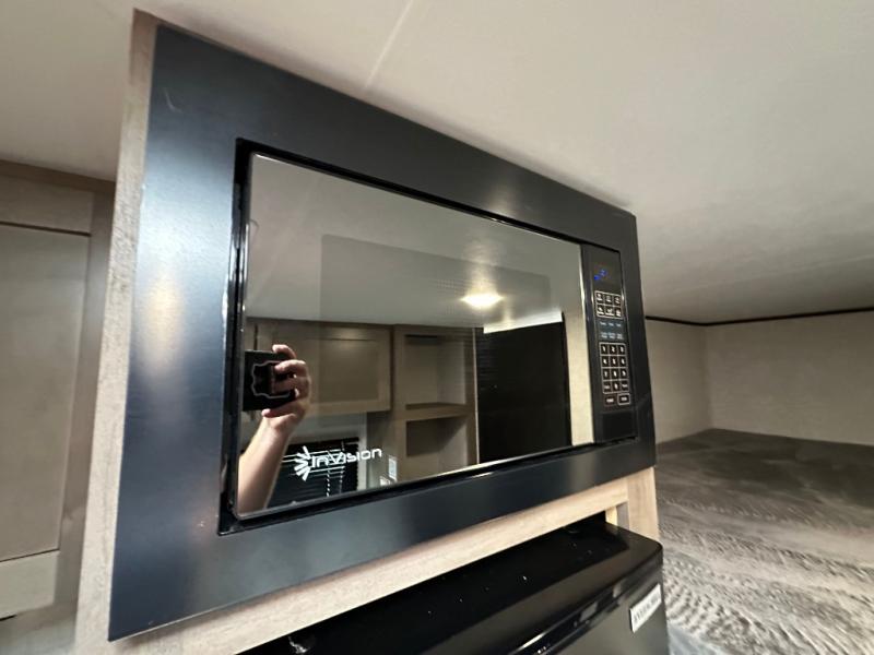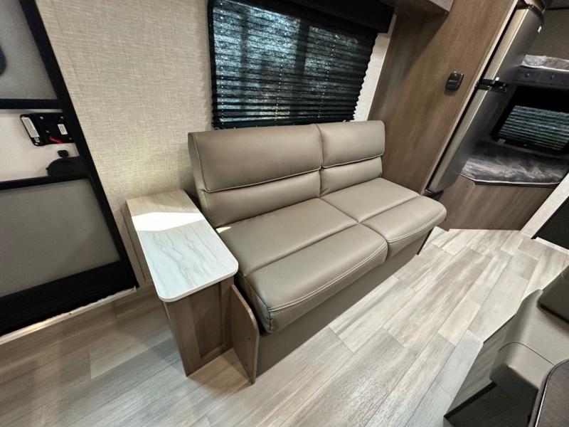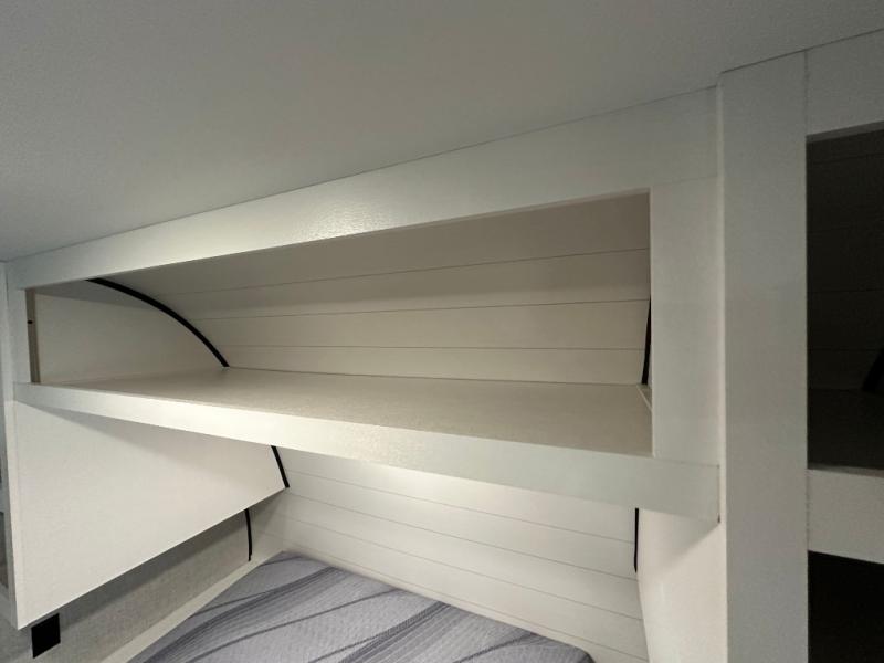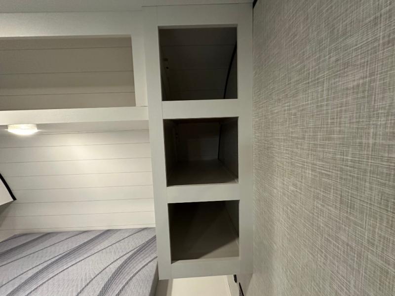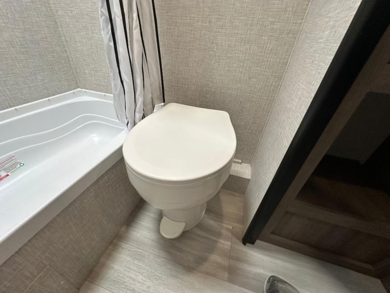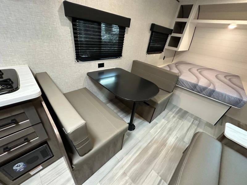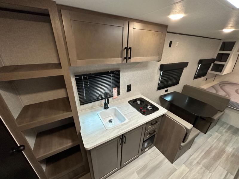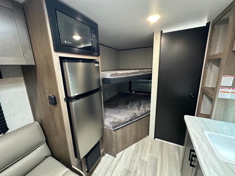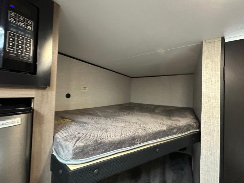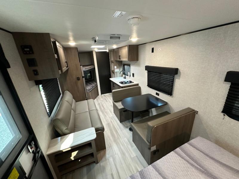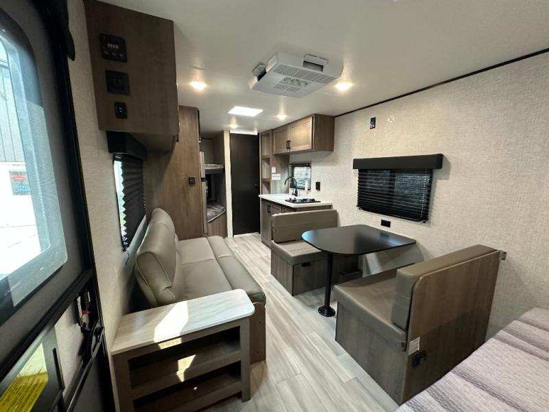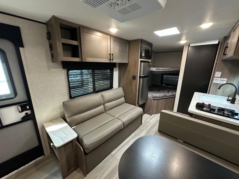 This Open Range Conventional COLT travel trailer is perfect for all your camping needs. The double-size bunk beds provide comfortable sleeping quarters for kids, while the tub/shower bathroom offers convenience and relaxation. A wardrobe provides ample storage for clothes and gear. Moving to the kitchen area, the two-burner stove top and microwave make meal prep an easy task, and overhead cabinets offer additional storage. Also, the booth dinette is perfect for family meals and games. Moreover, the jackknife sofa provides a comfortable spot for relaxation. The front bedroom features a spacious sleeping area with wardrobes on each side of the bed, offering plenty of storage for your belongings, and the 10' power awning provides shade and protection, creating a comfortable outdoor living space.