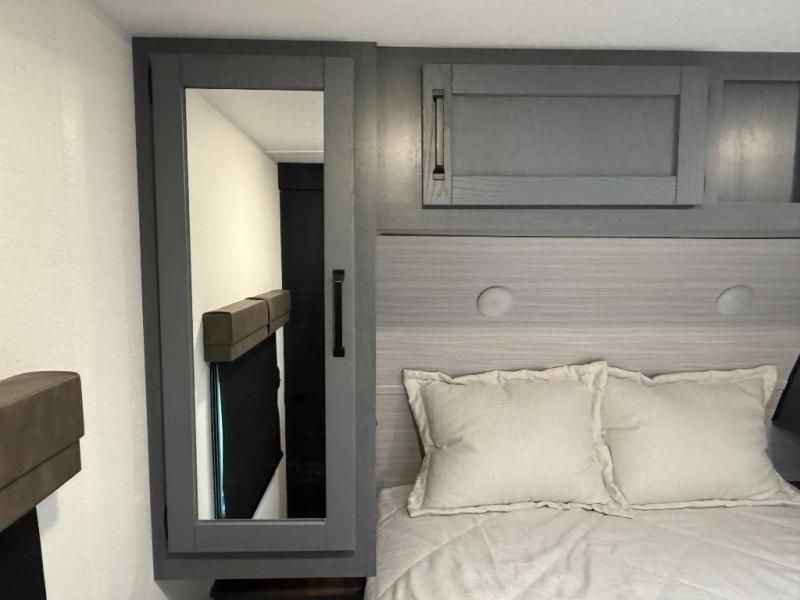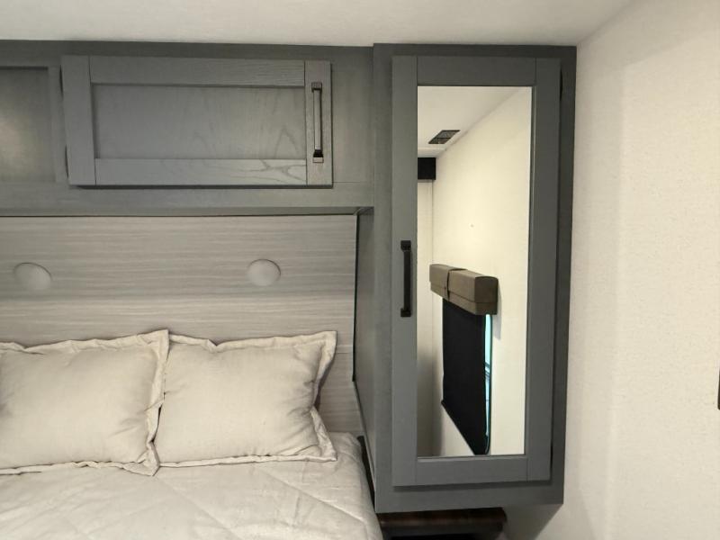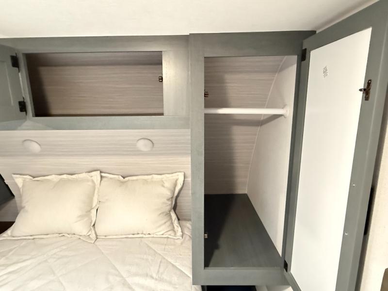 Private front bedroom with a queen bed, dual wardrobes/nightstands, overhead storage.