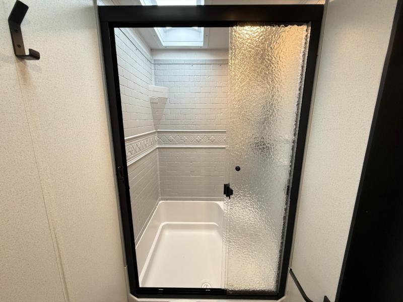 Spacious rear bathroom: includes shower, vanity, medicine cabinet, skylight, foot-flush toilet.