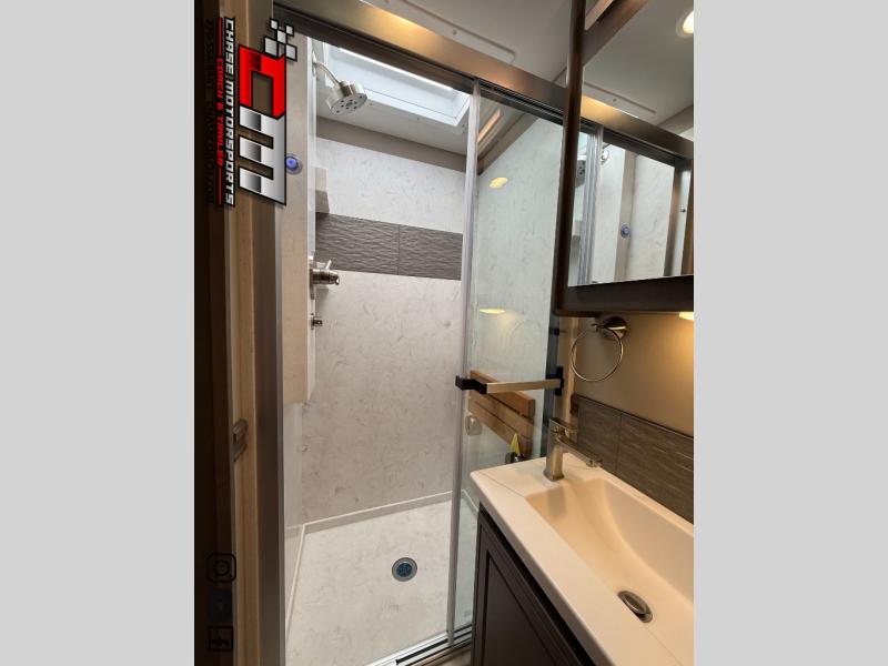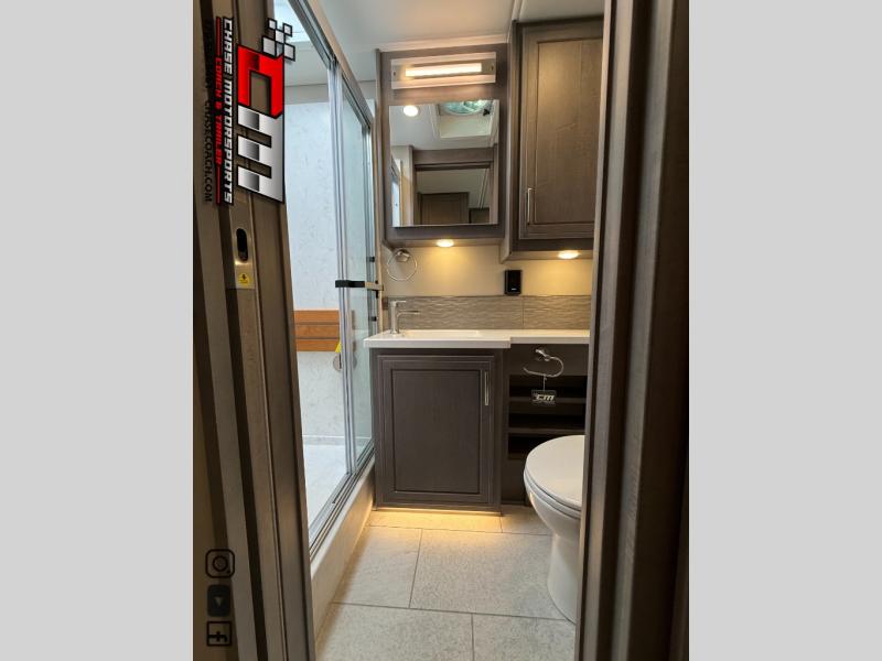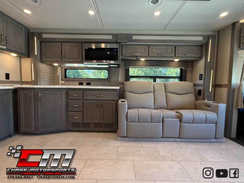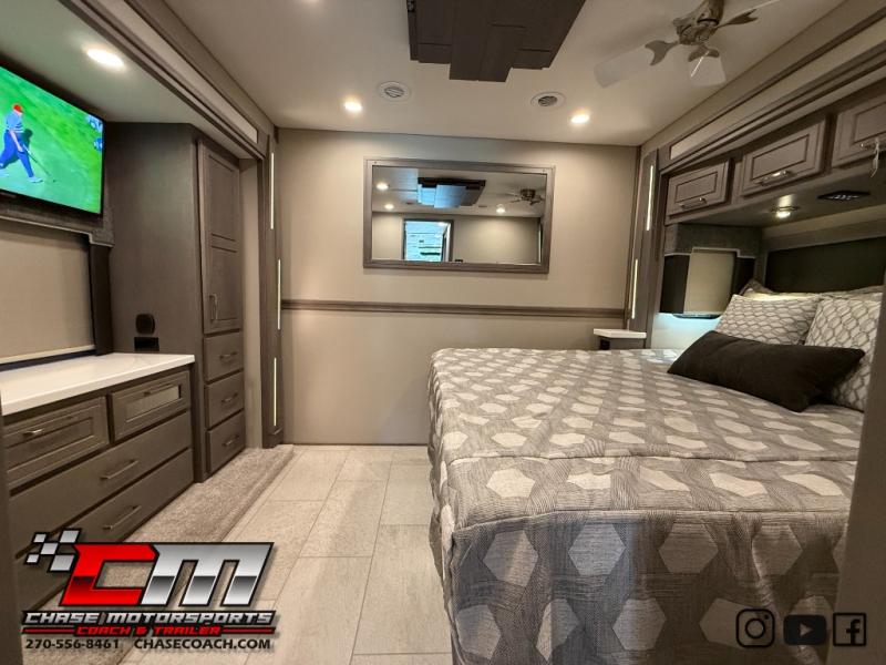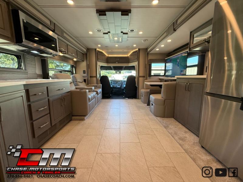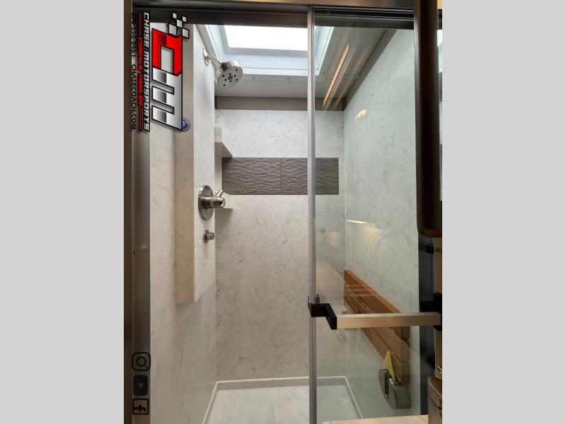 You will be completely ready to take on the next adventure with this Explorer Super C diesel motorhome! This coach delivers a comfortable, attractive, modern interior in which you can spend your time. There are loads of the latest appliances, like the 18-cubic foot French door refrigerator, stainless steel convection microwave, and two-burner induction cooktop. The full bathroom will be exceptionally helpful when getting ready with its shower skylight and LED vanity light, and the sofa sleeper is going to be a great place to sit down with a good book and cup of coffee. You will also appreciate having a booth dinette so that you can sit down together to enjoy a meal. Get a good night's rest each night on the 66" x 74" king bed slide across from another slide that houses a dresser base with closets on either side in the rear private bedroom!