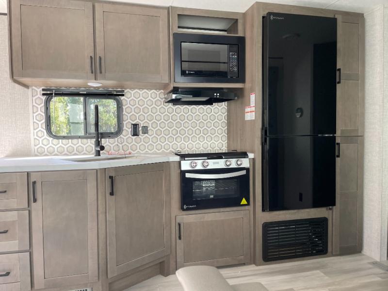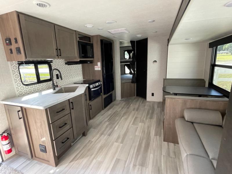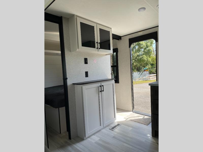 Enjoy camping at local RV spots or even national parks in this dual axle trailer that offers a large slide with a jackknife sofa and booth dinette for more sleeping space and interior room to relax. There is a full bathroom to get cleaned up in with extra counter space for toiletries, and the kitchen provides a three burner range with glass cover, a 17" oven and a pantry to hold all the goodies. You can enter the front bedroom from each side of the entertainment center giving you your own side, and there are dual wardrobes plus a shelf overhead. And don't forget about the 16' power awning with LED lighting, the exterior storage for your outdoor gear and the outside kitchen. You might even like to add a few options, take a look at the list!
