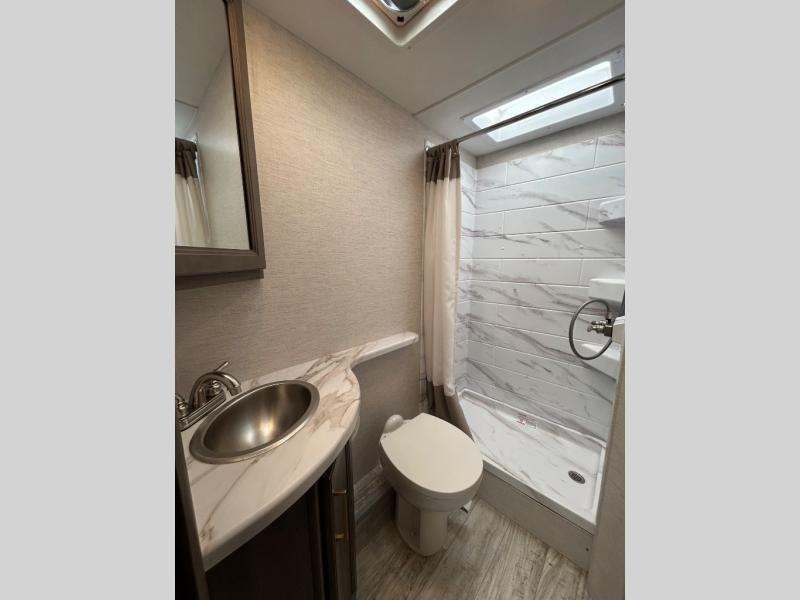 It won't be hard to find comfort in this coach for five! You can freshen up in the rear corner full bath once you've set up camp, then make lunch on the two burner gas cooktop or convection microwave with an air fryer. There is also a 12V refrigerator for cold items and a flip-up countertop for more space. Whether you dine at the Dream Dinette or take your plate outdoors under the 15' power awning, you're sure to have a great time in this motorhome. There is a semi-private bedroom with a 60" x 74" RV queen bed slide and bedroom TV prep if you want the option to watch movies in bed. And your guests can take the Dream Dinette and cab-over bunk at night!