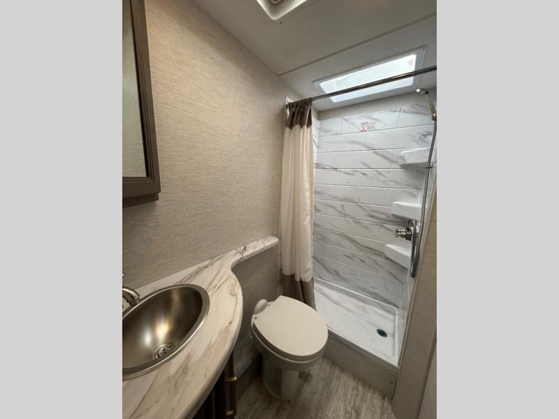 It won't be hard to find comfort in this coach for five! You can freshen up in the rear corner full bath once you've set up camp, then make lunch on the two burner gas cooktop or convection microwave with an air fryer. There is also a 12V refrigerator for cold items and a flip-up countertop for more space. Whether you dine at the Dream Dinette or take your plate outdoors under the 15' power awning, you're sure to have a great time in this motorhome. There is a semi-private bedroom with a 60" x 74" RV queen bed slide and bedroom TV prep if you want the option to watch movies in bed. And your guests can take the Dream Dinette and cab-over bunk at night!