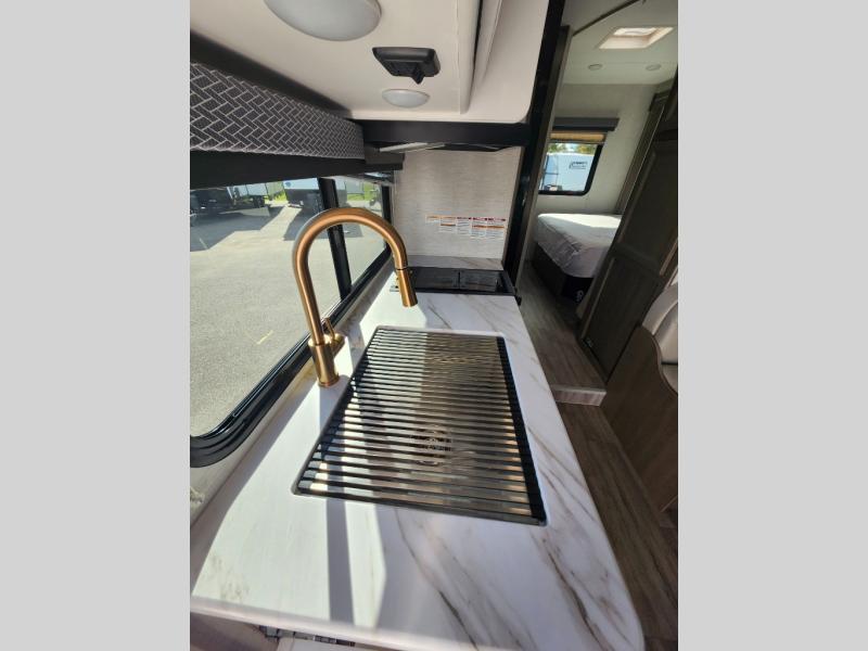 With any Four Winds ESpec Class C gas motorhome by Thor Motor Coach, you will find convenient amenities, a modern interior, and a reliable Ford E-Series chassis, with an optional Chevy chassis on select models to power your adventures. There is welded tubular aluminum roof and sidewall cage construction, a one-piece fiberglass front cap, and a one-piece domed roof membrane for added strength. Residential vinyl flooring will be easy to keep clean, and you'll love the sleek look of the Hampton Collection, two-toned cabinets. These motorhomes also include a 50 state 4.0 kW dual gas/LP generator and a 30-amp shoreline power cord to keep you going, along with a tankless water heater and 13,500 roof front A/C to ensure your comfort!