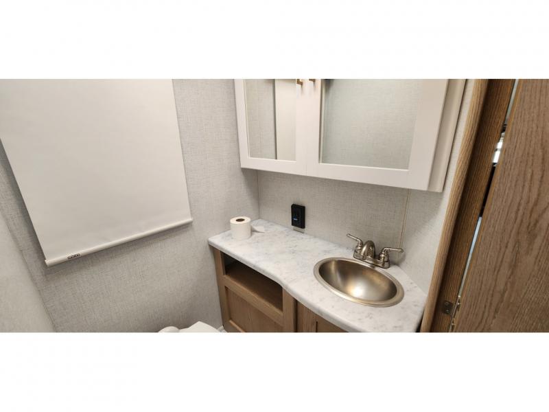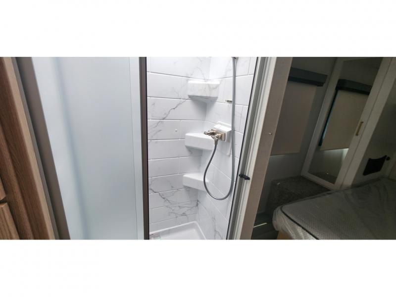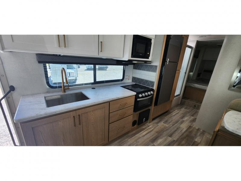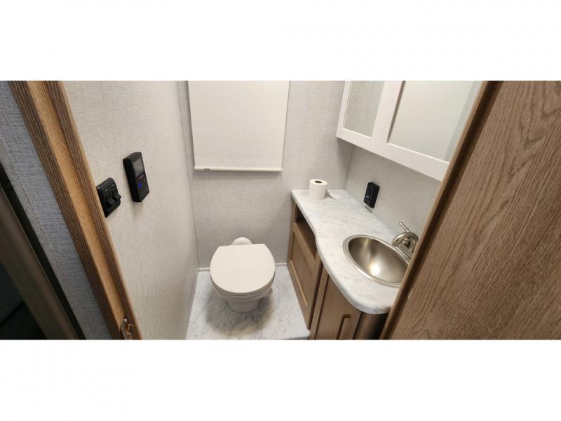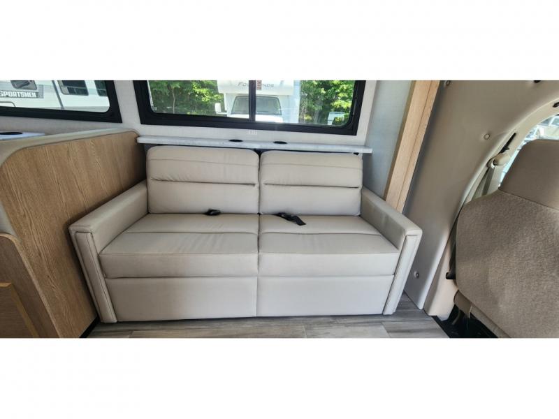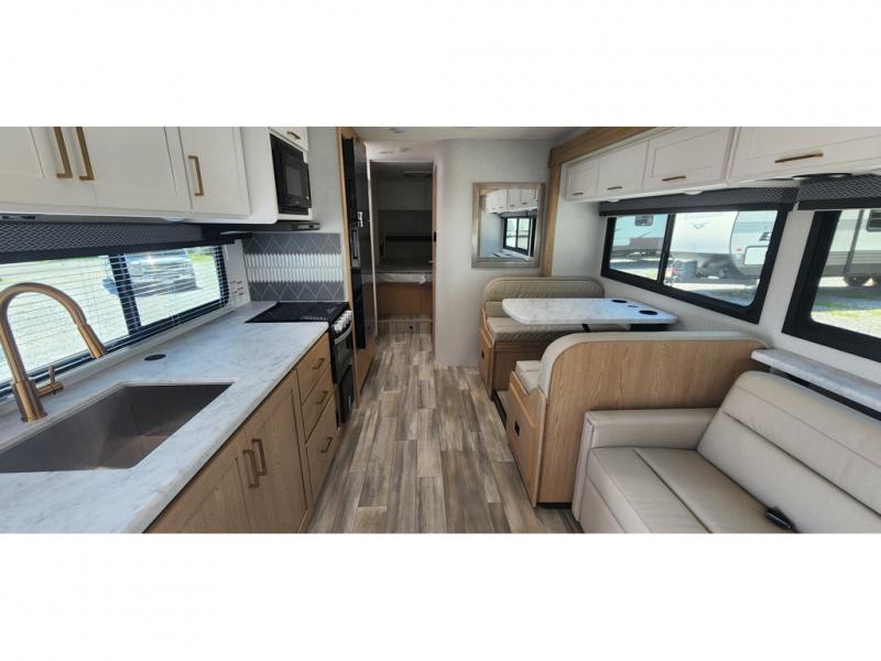 You and your spouse can go on your best adventures in this motorhome! You will have great views out of the many windows when you are indoors, and the power awning offers an outdoor living area protected by the elements when you want some fresh air. The cook will love the large single bowl stainless steel sink with a single handle faucet with a pull-down sprayer when cleaning fruits and veggies, the gas cooktop and microwave when making meals, as well as the 12V refrigerator to hold all the cold items. The slide out creates even more floor space, the 71" Dream Dinette and 66" jackknife sofa offers a place to dine and visit as well as sleep, and the rear private bedroom with a full bathroom just steps away will complete the deal! You will also appreciate the optional exterior TV to watch your favorite shows while breathing in fresh air!