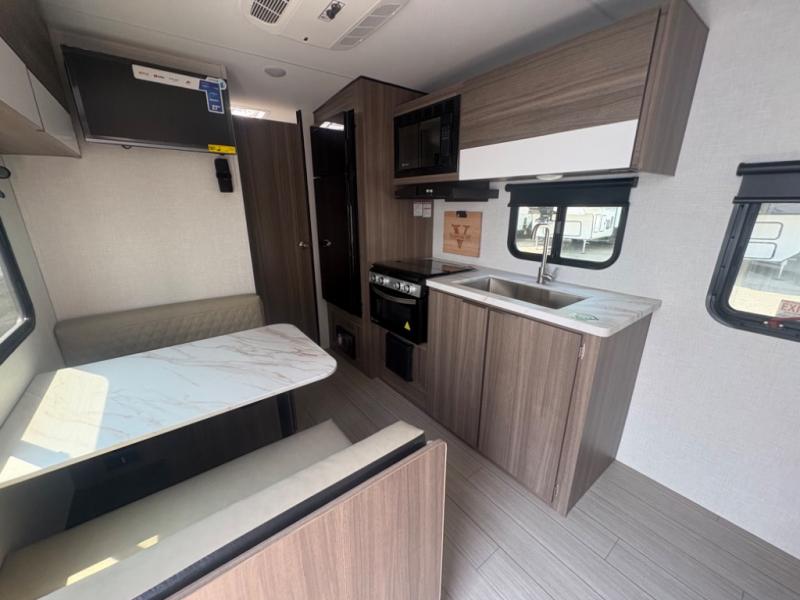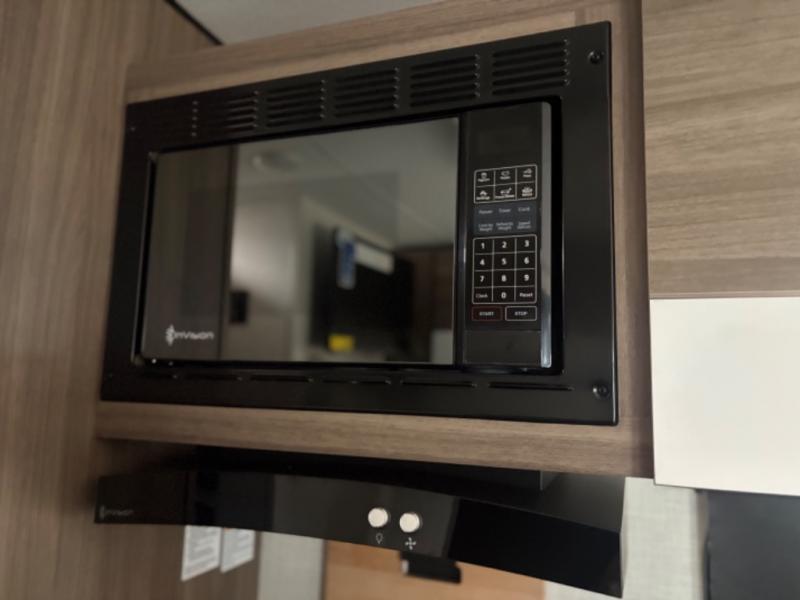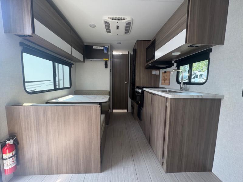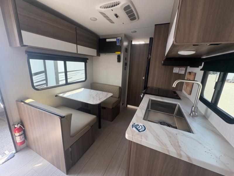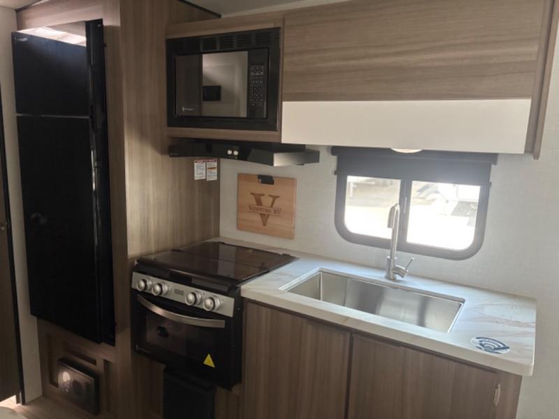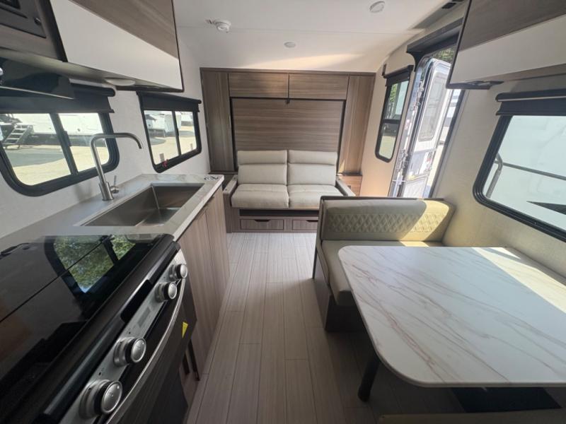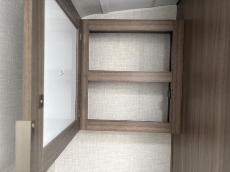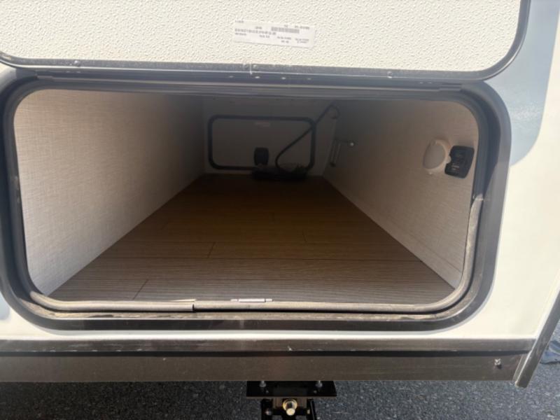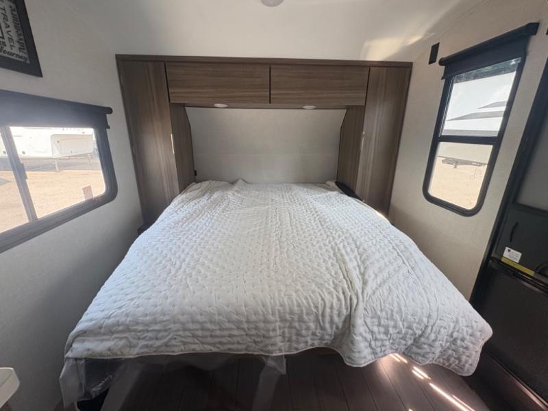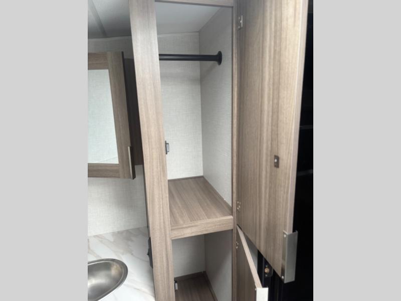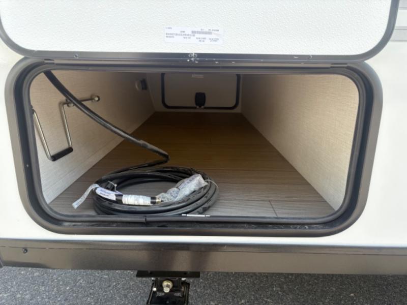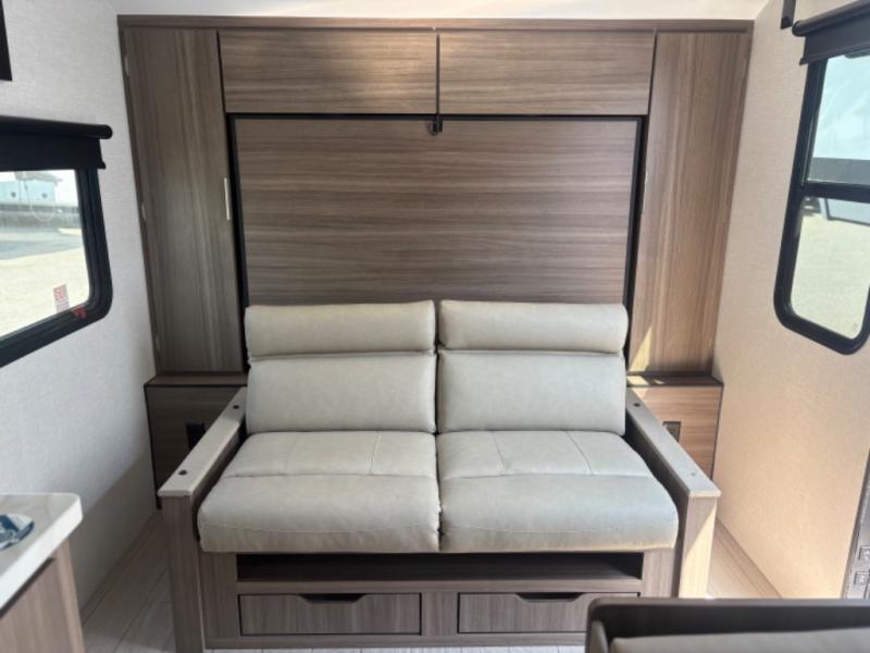This versatile travel trailer gives you a sofa during the daytime to relax on up front and a Murphy bed to easily setup at night. There are dual wardrobes for your clothing, StorMore bedside nightstands with a 110V outlet and USB charging for your cellphones and such, and a rear full bathroom with linen storage in two places, a 34" radius shower, and medicine cabinet for more items. The galley kitchen offers appliances to make warm meals and store leftovers, and the booth dinette on the opposite side provides dining inside plus a sleeping space at night. Your outdoor gear can be placed in the pass-through compartment along the exterior, and you can always relax under the 13' power awning before and after the day's activities.