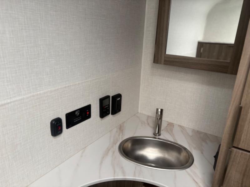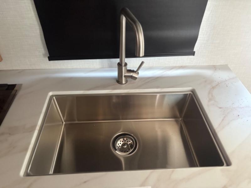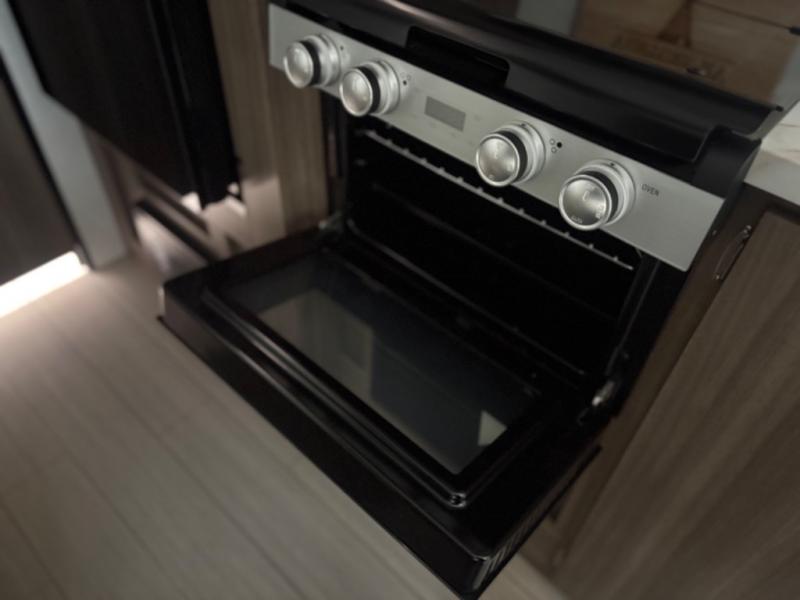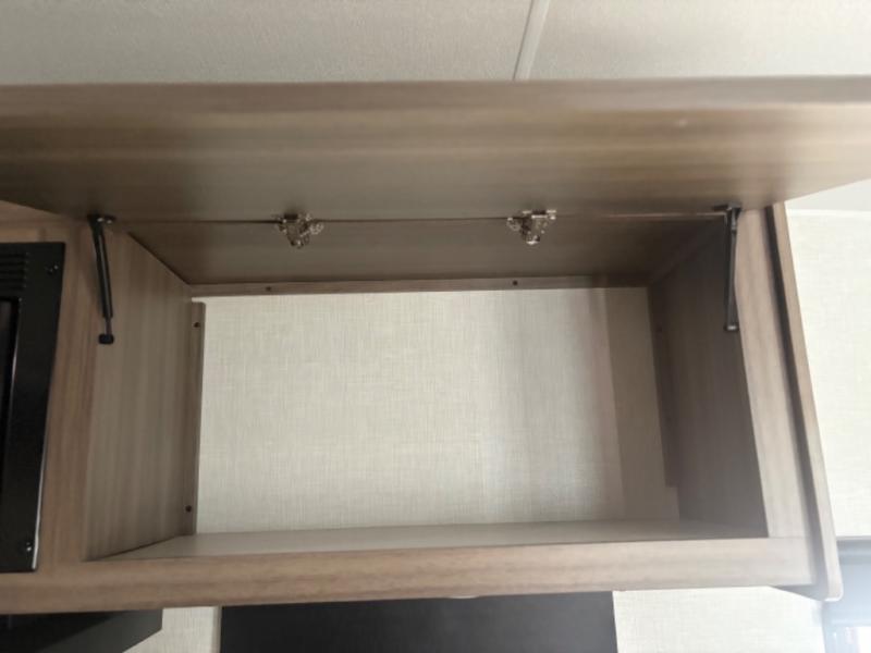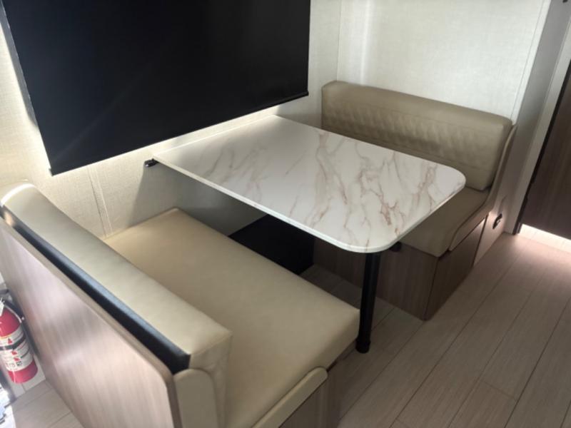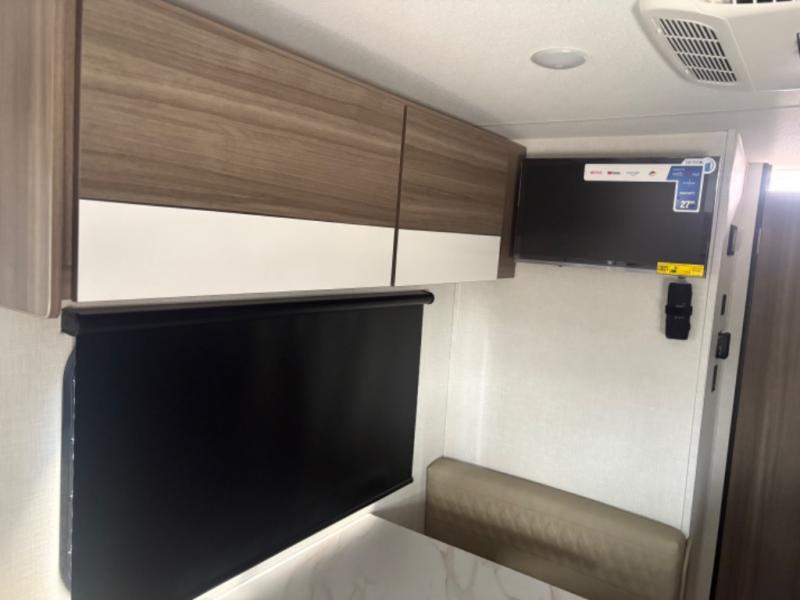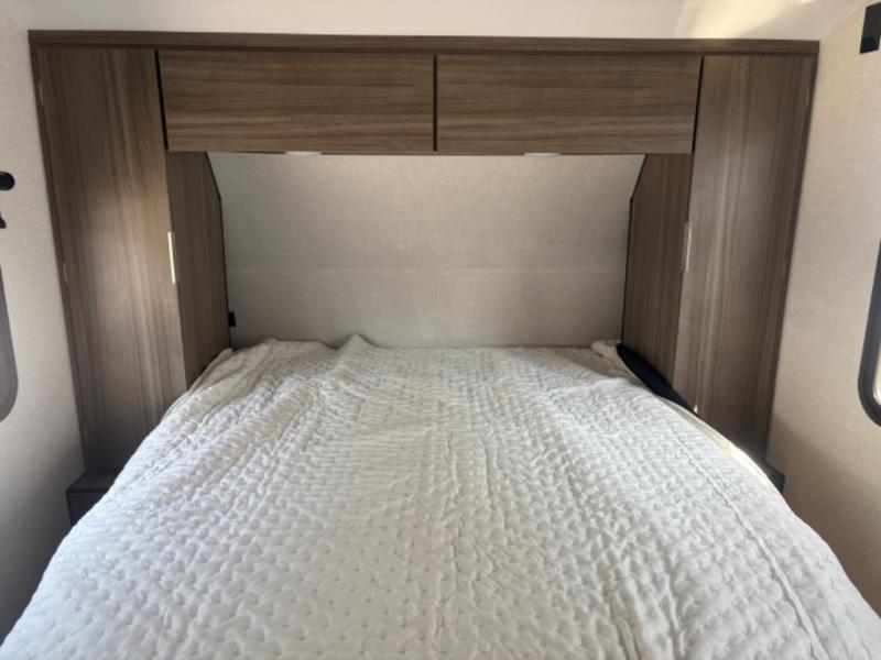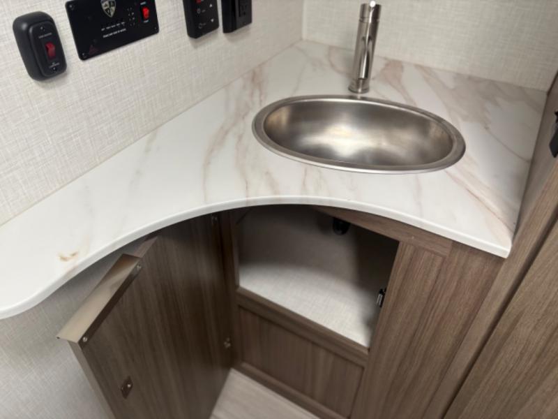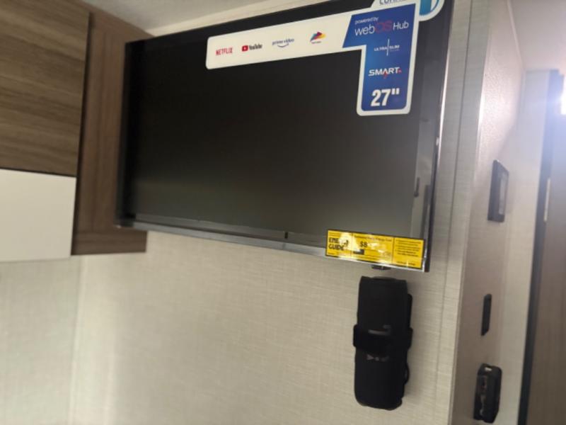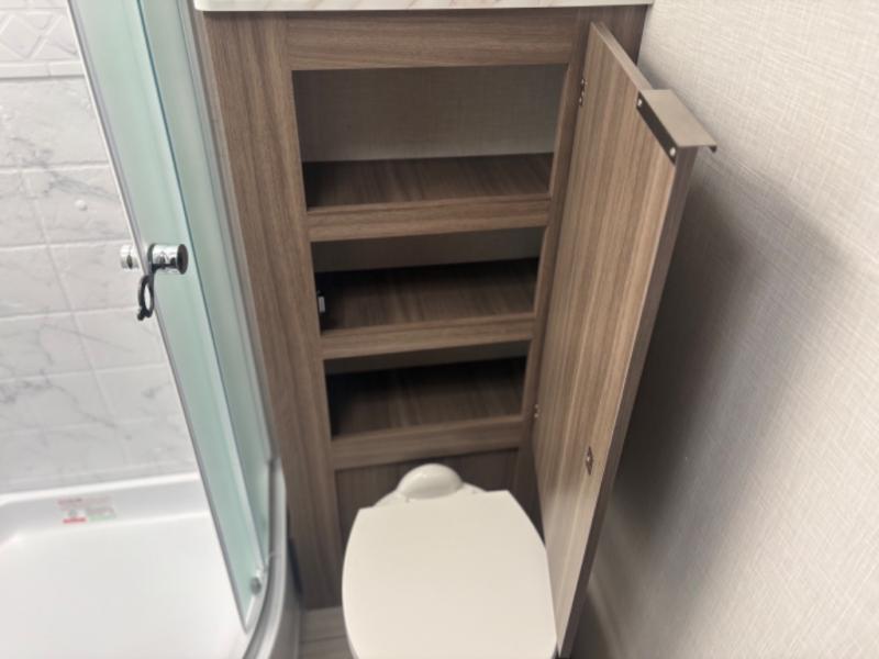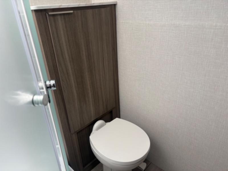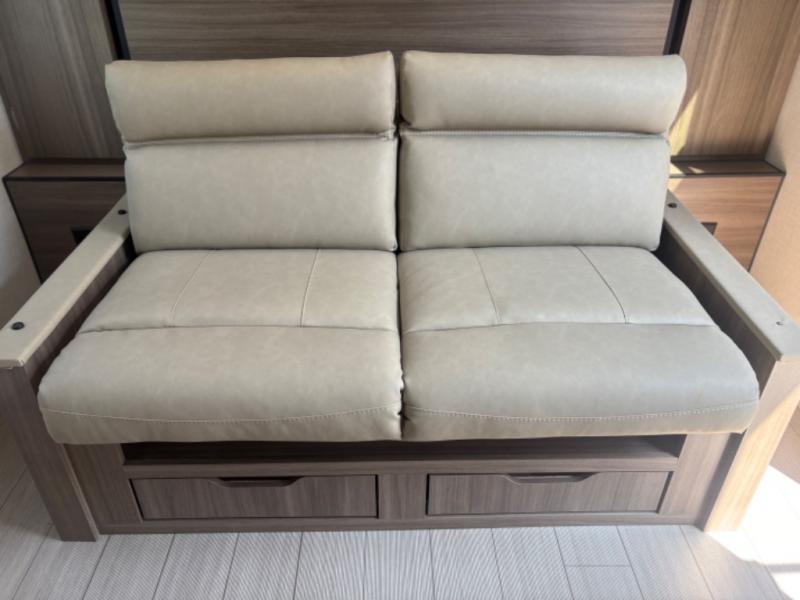 This versatile travel trailer gives you a sofa during the daytime to relax on up front and a Murphy bed to easily setup at night. There are dual wardrobes for your clothing, StorMore bedside nightstands with a 110V outlet and USB charging for your cellphones and such, and a rear full bathroom with linen storage in two places, a 34" radius shower, and medicine cabinet for more items. The galley kitchen offers appliances to make warm meals and store leftovers, and the booth dinette on the opposite side provides dining inside plus a sleeping space at night. Your outdoor gear can be placed in the pass-through compartment along the exterior, and you can always relax under the 13' power awning before and after the day's activities.