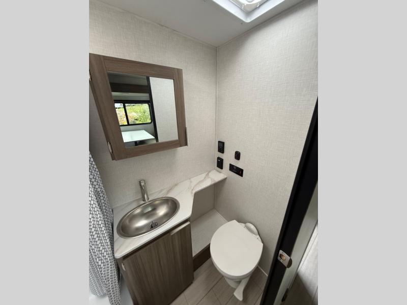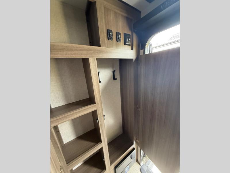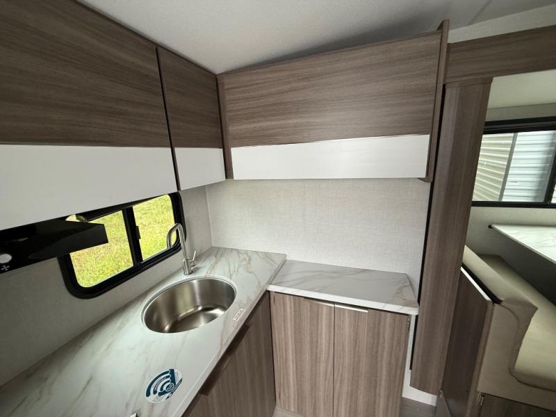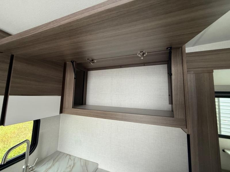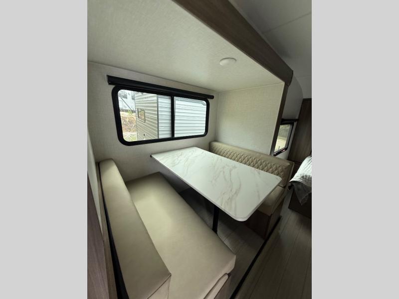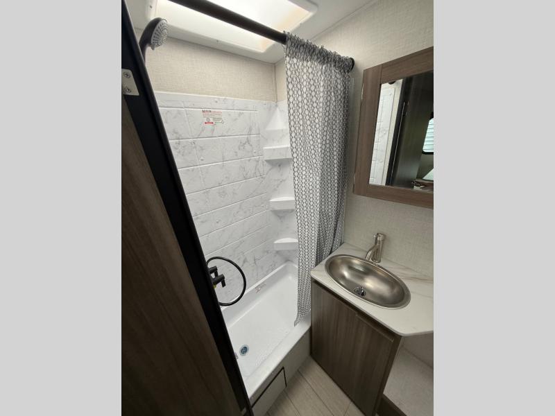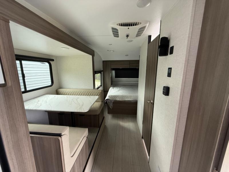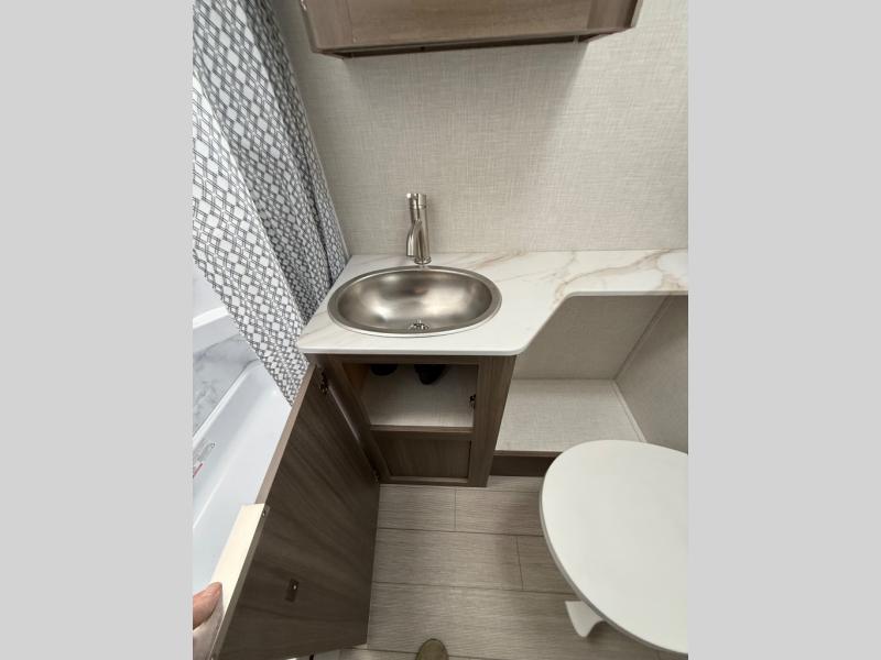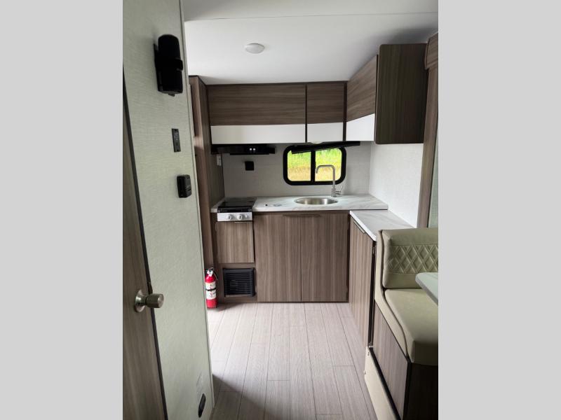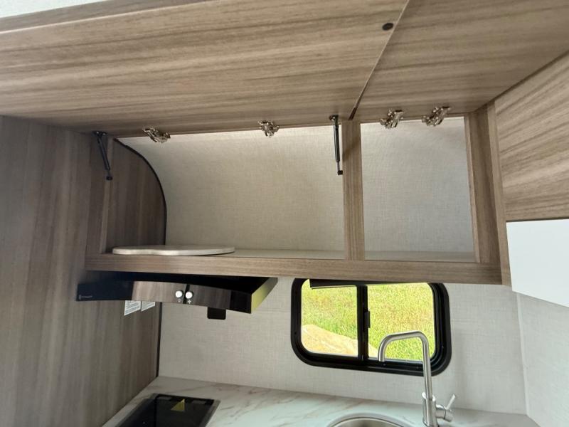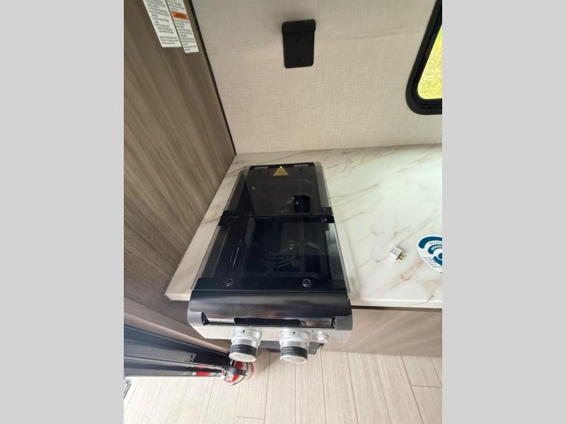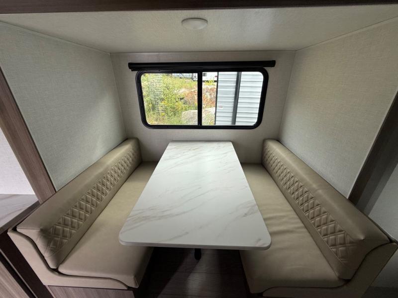 Enjoy camping with your favorite person and/or your family in this trailer that offers a rear kitchen with a two burner cooktop and convection microwave, windows and overhead cabinets for dishes and spices, plus next to the entry there is an 8 cu. ft. refrigerator and a pantry/closet to easily grab a drink and snack on your way out to explore. Yet you might want to relax under the 13' power awning before heading out. And when you get back, you can get cleaned up in the full bathroom before falling asleep on the front RV queen bed with StorMore bedside nightstands and a 110V outlet plus USB charging for your cellphones, and one to two tired campers can sleep on the sit n' slide booth dinette.